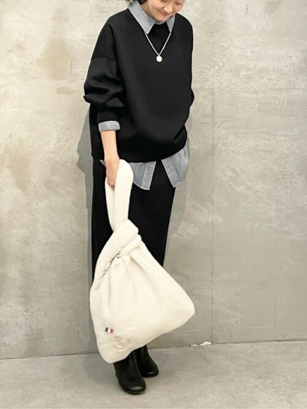【カットソー】Fサイズ ソデパフデザインが女性らしいダンボールトップス。 166cmで腰骨あたりの着丈なので合わせるボトムの幅が広いです。 手洗い可 【デニムシャツ】Fサイズ シフォンデニムシャツ。 シフォン生地でガーゼのように軽い生地なので、重ね着しても嵩張りません。 オールシーズン使えるコットン100%です。 手洗い可 【スカート】1サイズ着用 トップスと同じダンボール生地のタイトスカート。 裏地付きでラインを拾わず、生地に伸縮性があるので穿き心地楽ちんです。 166cmで1サイズ着用でふくらはぎにかかる長さです。 手洗い可 【バッグ】 もこもこトート。 柔らかなボアが肌あたりも優しく、肩掛けできる持ち手の長さも魅力。 フランス国旗のブローチ付きで、お好きな場所に付け替えられます。