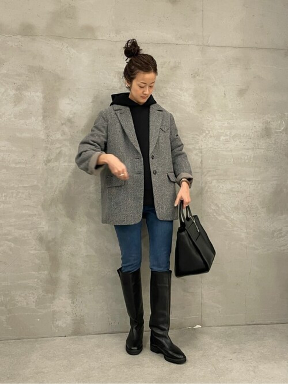 166cm ウェーブ イエベ/秋 【ジャケット】Fサイズ 中綿入りでコートのように着れるオーバーサイズジャケット。 メンズライクなツイード生地で、ざくっと着たい。 お袖を折り返すと起毛感のある裏地が見えてアクセントになります。 厚手のパーカーも中に着れる余裕ありです。 【パーカー】Fサイズ ダンボール生地で弾力があるゆったりパーカー。 フードの立ち上がりがしっかりしているので横、後ろから見た時にラフな印象になりにくいです。 【バッグ】 持ち手の丸いデザインがポイントになるレザートートバッグ。 底や持ち手部分はフェイクレザー。 バックのみで自立するのでお仕事シーンで重宝しそう。 マチもかなり広いので書類はもちろん、お弁当箱なども入ります。