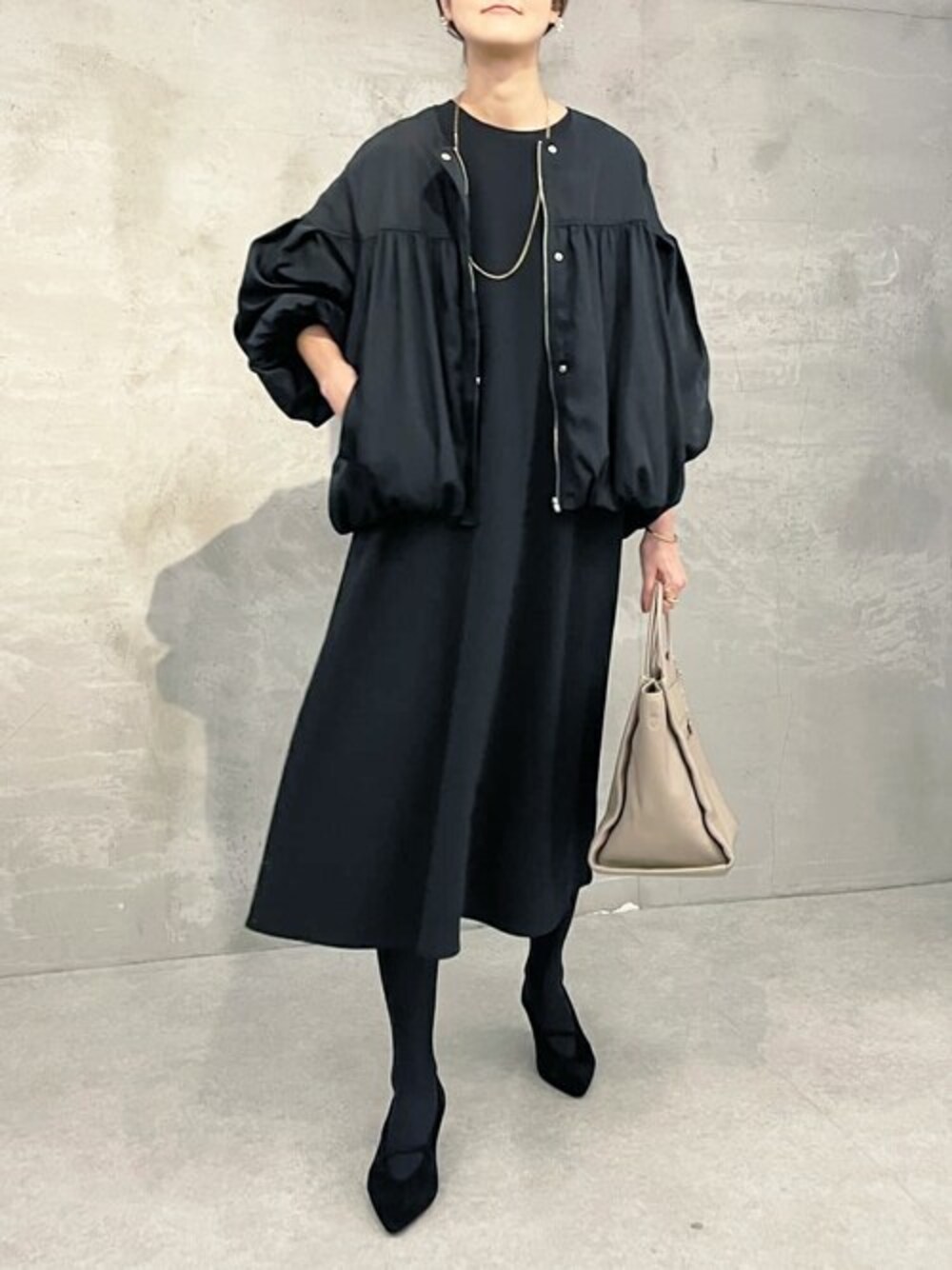 【ブルゾン】Fサイズ ショート丈のギャザーブルゾン。 内側には身頃・袖までキルティング仕様になっていて、保温性があります。 袖にはゴム入りできゅっとたくしあげてボリューム袖にしても素敵。 ギャザーたっぷりですが、裾にもゴムが入っていて広がりにくい。 ポリエステルですが、シャカシャカしにくくしっとりした生地感です。 166cmでおしりにかかる着丈で、ワンピースやスカート、ワイドパンツとバランスがかなり取りやすいです。 【ワンピース】1サイズ着用 Tブラウスと同素材のTワンピース。 伸縮性抜群で着心地楽なのに、ON/OFF使えて困った時に頼りになる1枚。 166cm1サイズ着用でふくらはぎにかかる長さです。