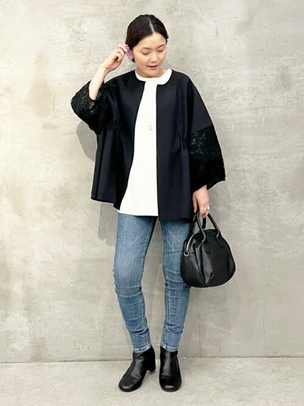 【outer】着用サイズ F size お袖のレースがポイントの羽織り 上品な印象でお仕事や学校行事などにもおすすめ サラッとした素材感でシーズン長く使いやすく 春先も使えるアウター ヒップラインが隠れるくらいの着丈で ゆったり安心があるのも嬉しいポイント 【inner】着用サイズ Fsize 程よい厚みで安心感があるカットソー スッキリとした着丈で インナーとしても使いやすく あると便利なカットソーです。 【pants】着用サイズ 0size ウエストゴムの楽ちんパンツ 細身でスッキリとしていますが ストレッチが効いていて 動きやすく穿きやすいアイテム お家で手洗いできるので ご旅行などにもおすすめです。