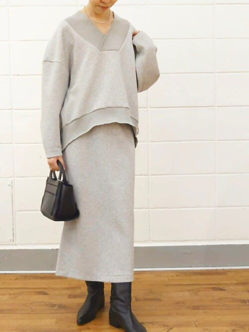 【tops】 浅めのVネックなので、お顔周りすっきり見えます。太めのリブがアクセントになり、着るだけで立体的なシルエットになるので着映えします。 セットアップで揃えておくとちょっとしたお出かけにも使えて便利ですね。シワにならないところも◎ 【skirt】 もちもちしたストレッチ性ある生地なので、とても穿きやすいです。 後ろにスリット入りなので歩きやすいです。 164cmでくるぶし見えるくらいの長めな着丈。 スニーカー合わせたりカジュアルにも使えますよ。