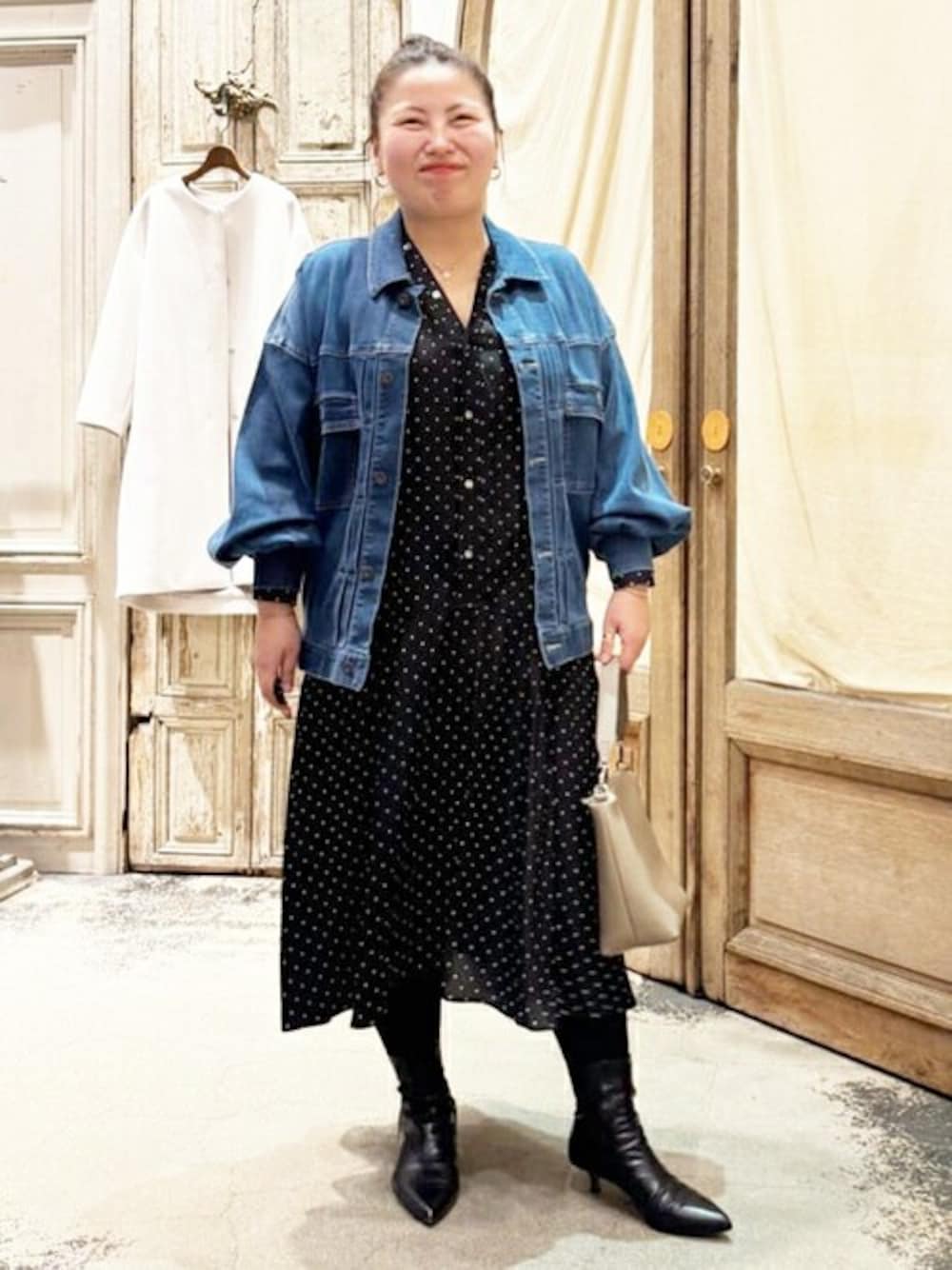 【ワンピース】 ぽっちゃりの私でもすっきり着れました!!! お胸周り苦しくなかったです。 私は首元のボタン2つ開けてきたらお顔周りすっきりしましたよ♩ 腰まわりもゆとりありです。 切り替えが絶妙ラインなので、オチ感綺麗でした。 足元で印象変わるので、スニーカーやブーツ、ふらっとシューズと合わせても素敵ですよ! 【Gジャン】2サイズ着用 私はフリーサイズですとボタン閉まらなかったです。 お袖ゆったりしてるので二の腕キツくないですよ! 軽いデニムでストレッチが効いているので、楽ちんです!