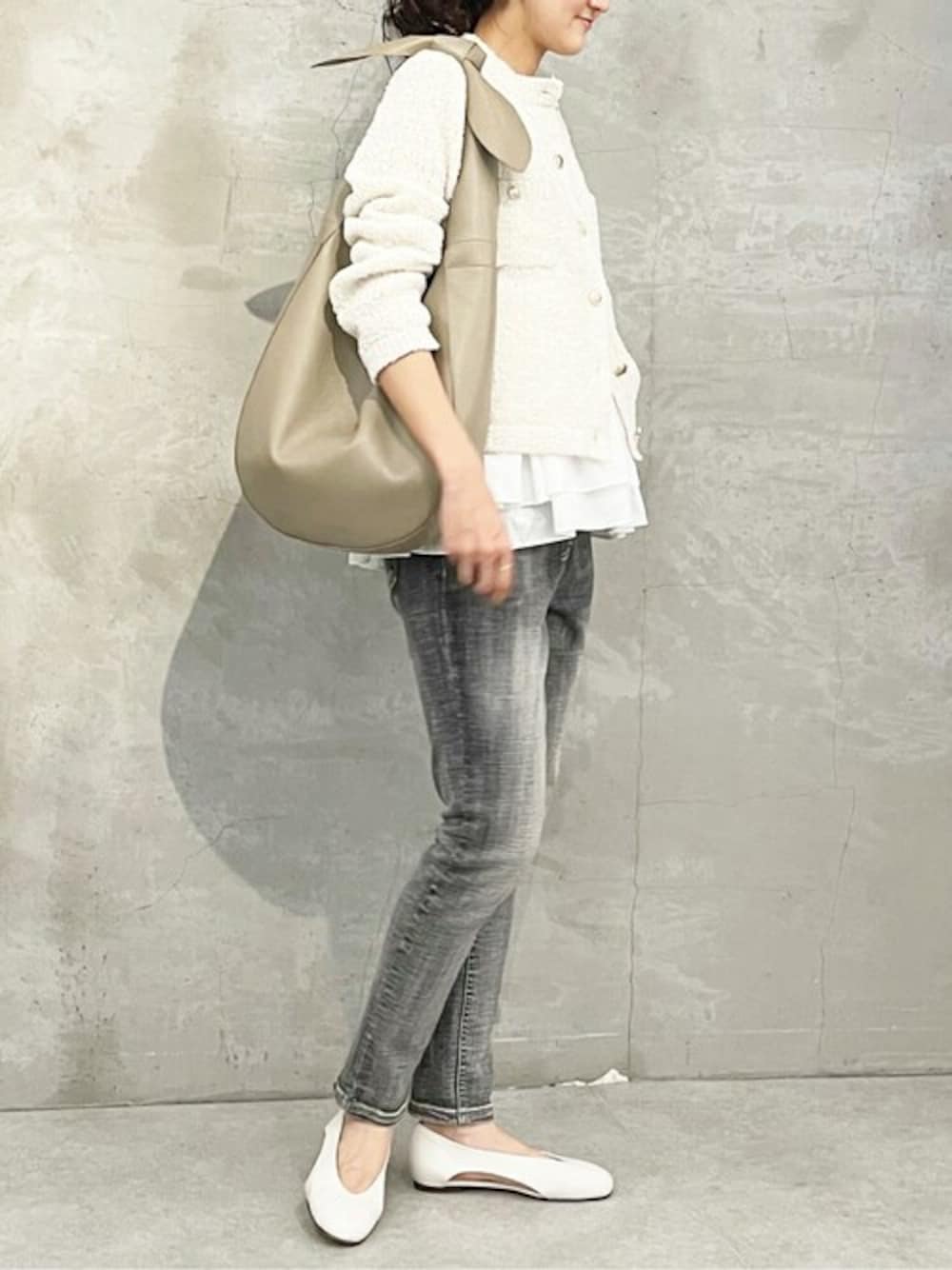 麻のような風合いのニットジャケットとギャザーペプラムブラウスをレイヤードして、デニムパギンスで抜け感を出したコーデ。 リボンレザートートとベージュトーンで合わせたのもポイントです。 デニムパギンス:グレー1サイズ着用
