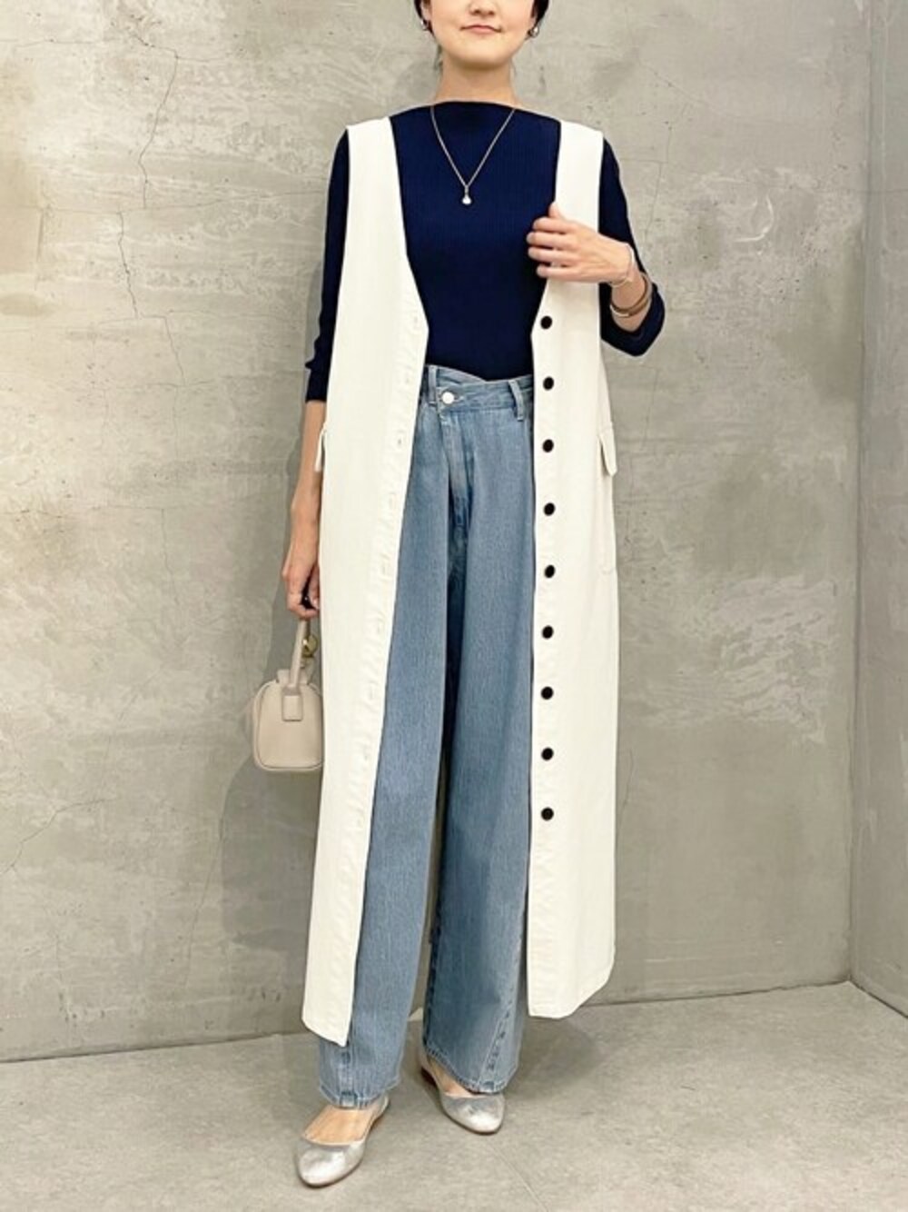 【ジャンパースカート】Fサイズ Vネックですっきり見えのジャンパースカート。 伸縮性のある生地ですがしっかり厚みがあるので透け感も気になりにくい。 アームホールもおおきめなので、ドルマンスリーブのインナーも合わせられます。 ボタンを開けて、ジレ風に着ても可愛かったです。 166cmでくるぶししっかり見える着丈です。 【ニット】Fサイズ シルク混の畦編みニット。 ボートネックで女性らしくすっきり見える。 サロペットやジャンスカのインナーに、Tシャツだとラフすぎるなとお悩みの方にも安心のニットです。