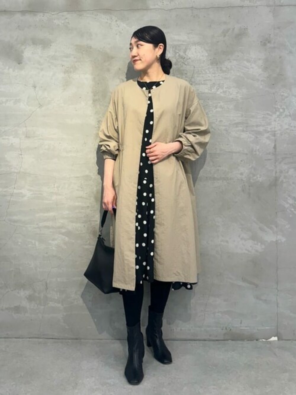 【one-piece】 大きめのランダムドットが素敵なワンピース 腰の位置で切り替えが入り程よいフレアシルエットが腰回りをカバー 動いた時のふわっとシルエットも大人可愛いです! 身頃はシワになりにくい素材に 袖口は伸縮のある異素材の組み合わせで ドット柄が単調にならずすっきり見えしてくれるのが◎ 一枚でおしゃれに決まるのでヘビロテ間違いなしです! 【coat】 Aラインが女性らしいフレアシルエットコート ウエストにドロストコードを通し 絞る事でシルエットの変化を楽しめます シワになりにくくシャツのようなとっても軽い生地で持ち運びも便利 ロングでも脱ぎ着しやすいのが嬉しいですね! しかも手洗い可能!! 袖口ゴム仕様でまくるとパフスリーブになるのも素敵 ノーカラーなのでハイネックなどのインナーとも好相性です 164cmで膝にかかるほどの長すぎない着丈ですので 着丈の長いロングスカートでもバランスがとりやすい! ワンピース合わせもバッチリですよ