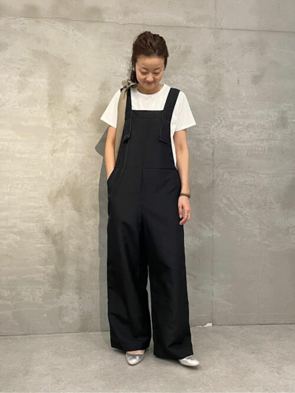 【サロペット】Fサイズ 光沢感があって軽やかな生地感のサロペット。 Tシャツ合わせも大人な雰囲気になります。 両サイドにボタン付きで幅感の調節ができるのと、 ショルダーベルトの後ろ部分で長さの調節ができ、166cmでくるぶし隠れる着丈から10cmほど短くできるのと、5cmほど長くもできそうです。