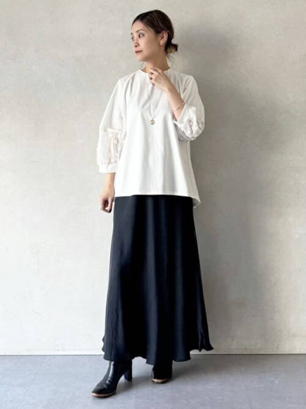 シンプルながら、実は袖口がシアー素材になっていて、フリンジのドットがさりげなくポイントになる大人可愛いカットソー☺️✨ 身頃はストレッチ抜群に着やすくて 後ろにタック入りで、ゆったりだけどスッキリ見えするシルエットです☺️ 後ろはお尻カバーできる長さだから、 長さ的にスカートだとバランス悪いかなって思ったけど、 前の方が短くて、やや後ろ下がりのシルエットだから 隠したいとこは隠しつつ、バランスも綺麗に取れましたよ👏👏 白は透け感気になるけど これはガッツリ透けないのが良かったです☺️ あとカットソーってカジュアルなイメージだけど、シアーとのコンビで上品さもあるのがオトナ女子にぴったりだなーって思いました🙆♀️
