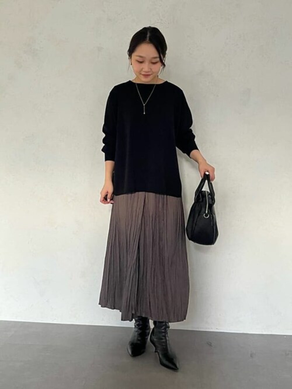 【tops】 さらさらもちもちの肌触りのトップス。 ニット素材なので上品見えします。 前後差のあるデザインで、サイドと横にスリットがあり、小柄さんもボトムを選ばずバランスがとりやすいです。 【pants】着用サイズ:0 シワが気にならず、畳んでもかさばらないので旅行など持ち運びにも便利です。 低身長でも安心の着丈です。