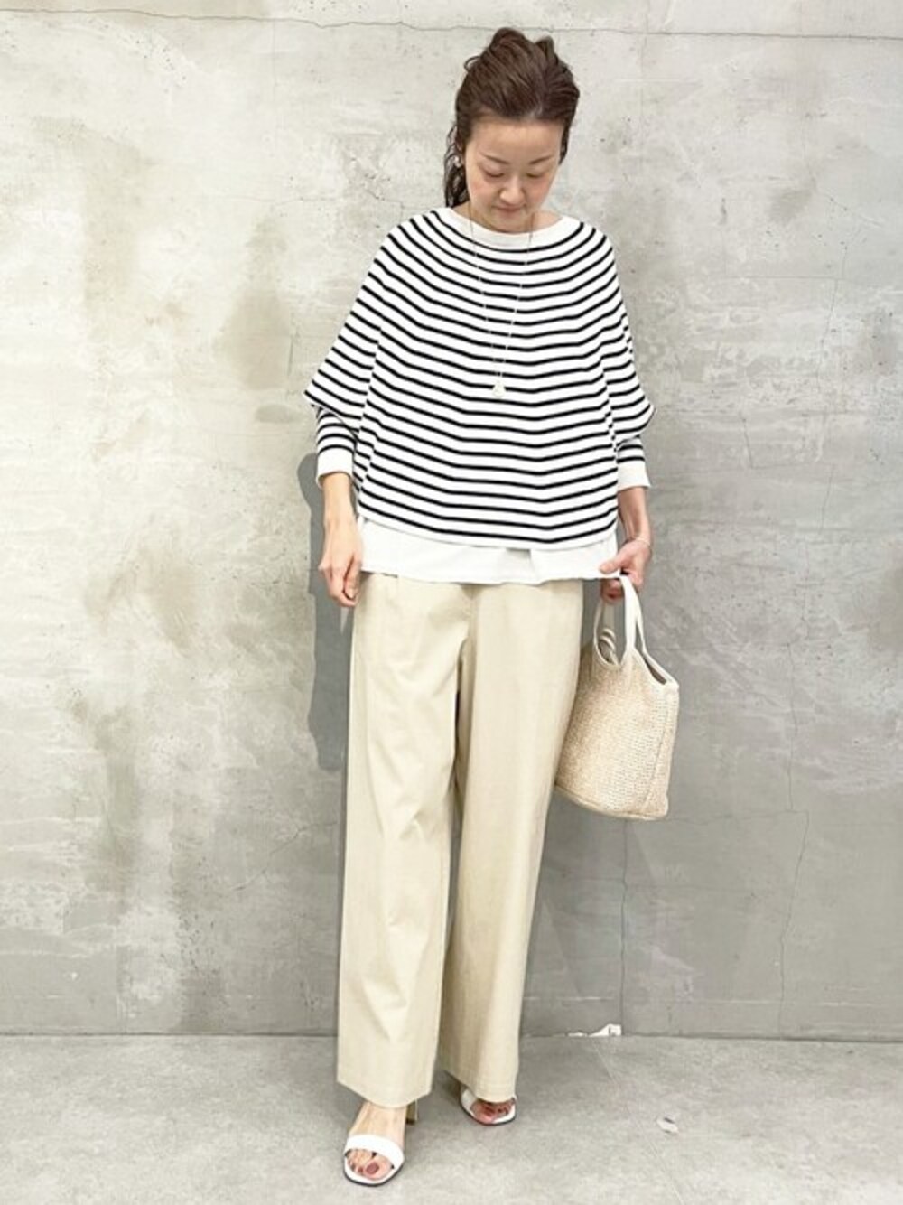 【コットンストレッチウエストリブパンツ】 ストレッチ抜群で履きやすいワイドパンツ。 生地にほんのりハリ感があって脚のラインを拾いにくい◎ そしてなんといっても ウエストがぐるっと1周リブデザインで、楽すぎ危険なパンツです。 チノパンだとラフすぎてしまうという方にもおすすめです。 選べる3サイズ展開なのも嬉しい。