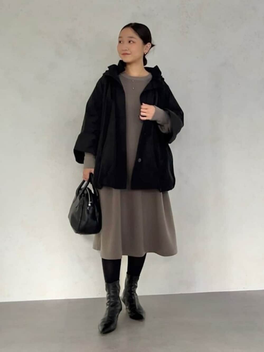 【outer】着用サイズ:F 丸みのあるバルーンシルエットが魅力のブルゾン。ポケットに紐を通していてリボンがアクセントに。軽量かつシワを気にせず着られるので、折り畳んで旅行にも便利です。 149cmでお尻が隠れるくらいの着丈でした。 【one-piece】 しっとりもちもちのダンボール素材のワンピース。 被るタイプのワンピースでストレッチが効いていて、とにかく着やすいです。 透け感は全く無いので一枚でも安心。シワも気になりにくいのでお手入れ楽ちんです。 149cmで膝下くらいの着丈。 ヒールのブーツと小さめのバッグで、少しフォーマルにも使えるコーディネートです。