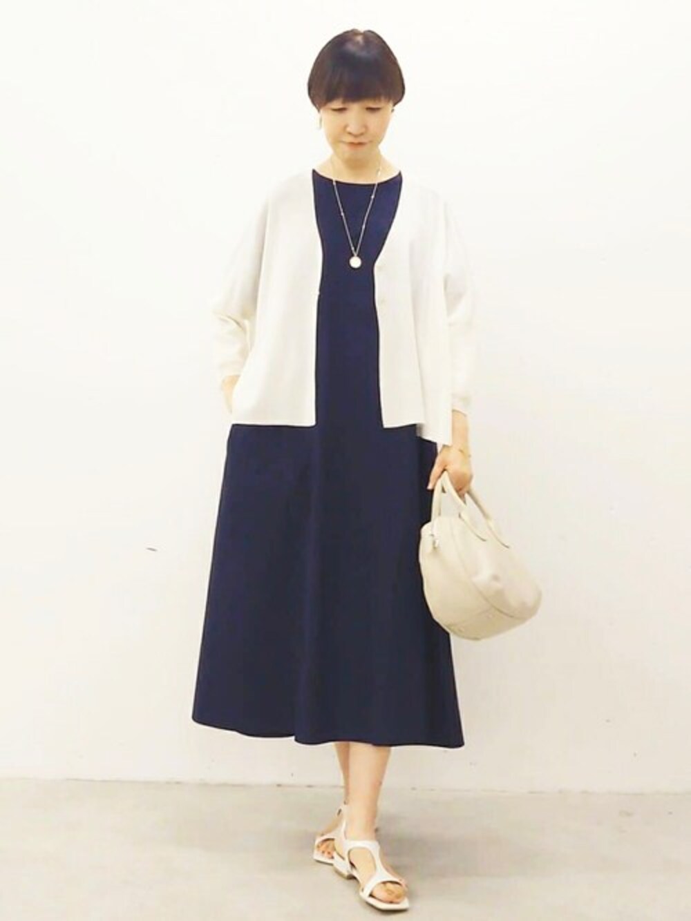 【onepiece】 1枚で着ても短すぎず長すぎずの着丈です。 半袖でも二の腕の気になる部分は隠れるので安心感ありました。 透け感もなく、切替え下は布帛の生地なのでラフになりすぎずデイリーにもお出かけにも便利。 シンプルなデザインなので、羽織りものとも好相性です。 【knit】 前後差のある絶妙なバランスで、ワンピースはもちろん、スカートやワイドパンツにも好バランスで着られるデザインです。 シャリ感のある糸で、その名のとおりサラッと快適な着心地です。 【bag】 小さすぎず、大きすぎず、必要最低限のものがしっかり入る見た目以上の容量の多さが人気の理由です! キズの目立たない質感のレザー、そしてどんな場面でも使えるシンプルなデザインなので、1つあれば大活躍すること間違いなしですよ。 【shoes】24.0cm着用 踵部分がゴム仕様なので、着脱が楽でした。 きちんとした装いにピッタリなデザインなのもアラフィフ世代におすすめポイントです。 疲れない程度のローヒールなところも嬉しいですね。 特別狭かったり広かったりせずの足幅だと思います。