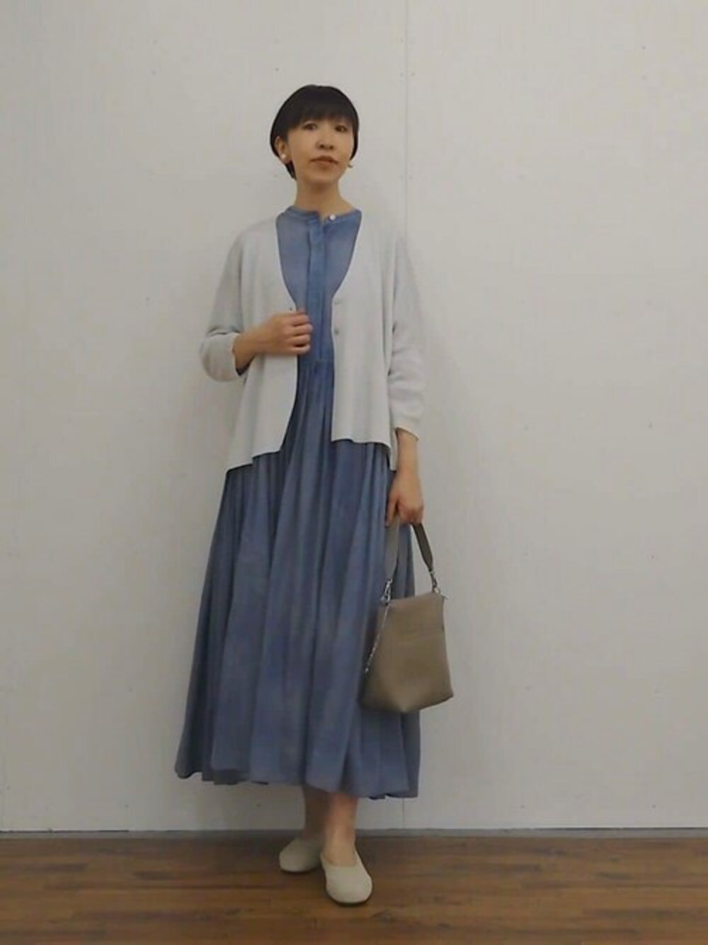 【onepiece】1サイズ着用 生地感とっても軽やかで、柔らかい着心地です。 ギャザーたっぷりで身幅はとてもゆったりしてますが、山なりにカーブして入っている為、ブワッと横には広がらず意外とすっきり見えます。 脚長効果もあるデザインです。 重ね着しやすいデザインなので、着回し力の高いところも◎ ムラ染めのようなニュアンスのあるカラーがアラフィフ世代にも着やすいですよ。 【cardigan】 前後差のある絶妙なバランスで、ワンピースはもちろん、スカートやワイドパンツにも好バランスで着られるデザインです。 シャリ感のある糸で、その名のとおりサラッと快適な着心地です。 この新色シルバーは繊細なキラキラ感が上品見えで、グレーみたいに顔映り沈まないですし、アラフィフ世代にとってもおすすめです!
