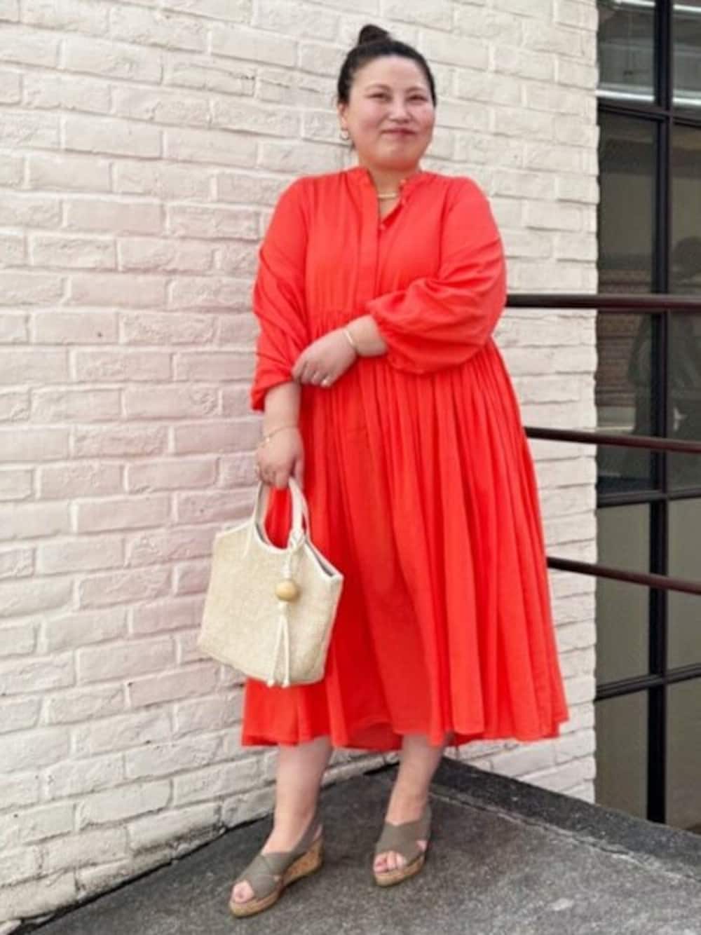 【ワンピース】1サイズ ギャザーたっぷりでふんわりですが、 柔らかい生地で落ち感あります。 158センチで足首が出る着丈ですよ! ギャザーは、山型なのでお腹まわりすっきりです。 お袖ゆったりしていますよ。 お袖にゴムが入っているので、お袖あげると手首綺麗に見えます。 ボタンは1番上まで閉めれますが、丸顔とクビが太めなのでボタン2つ〜3つまで開けるとすっきりします。 私が着用した際、ペチコートを着ていませんが 気になる方は中にペチコートやペチパンツ忍ばせてくださいね! ます!