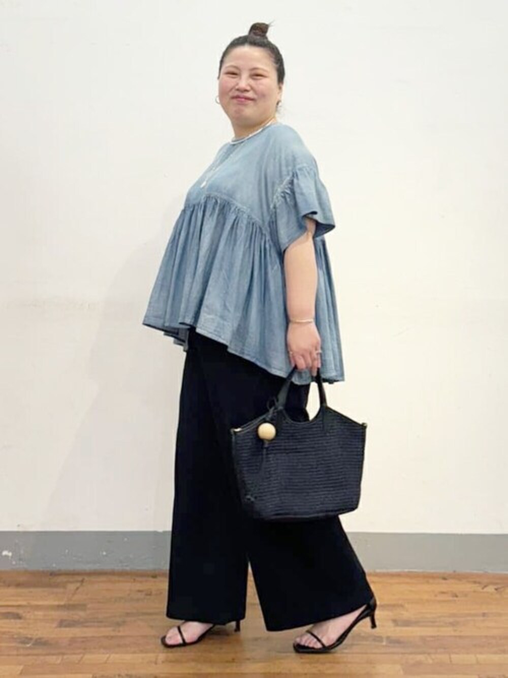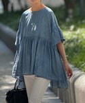 【シャツ】 柔らかいシャツです。 柔らかい生地ですが、身体のライン拾わないので嬉しい。 カラーがムラになっているので絶妙にすっきり見せてくれます。 二の腕が適度に隠れて安心! 着丈もお腹やお尻隠せるのでパンツや、タイトスカートと合わせても可愛かった! お胸からのギャザーですが、 生地が柔らかくて広がりすぎないです。 暑い季節にふわふわと風を含む素材なので、過ごしやすそう! 【パンツ】2サイズ着用 カジュアルにもキレイめにも着こなせる万能パンツです。 体型もカバーしてくれる優れもの!!! ウエストがリブとゴムなので楽ちん! 生地が柔らかく足のライン気にせず履けるのが好き