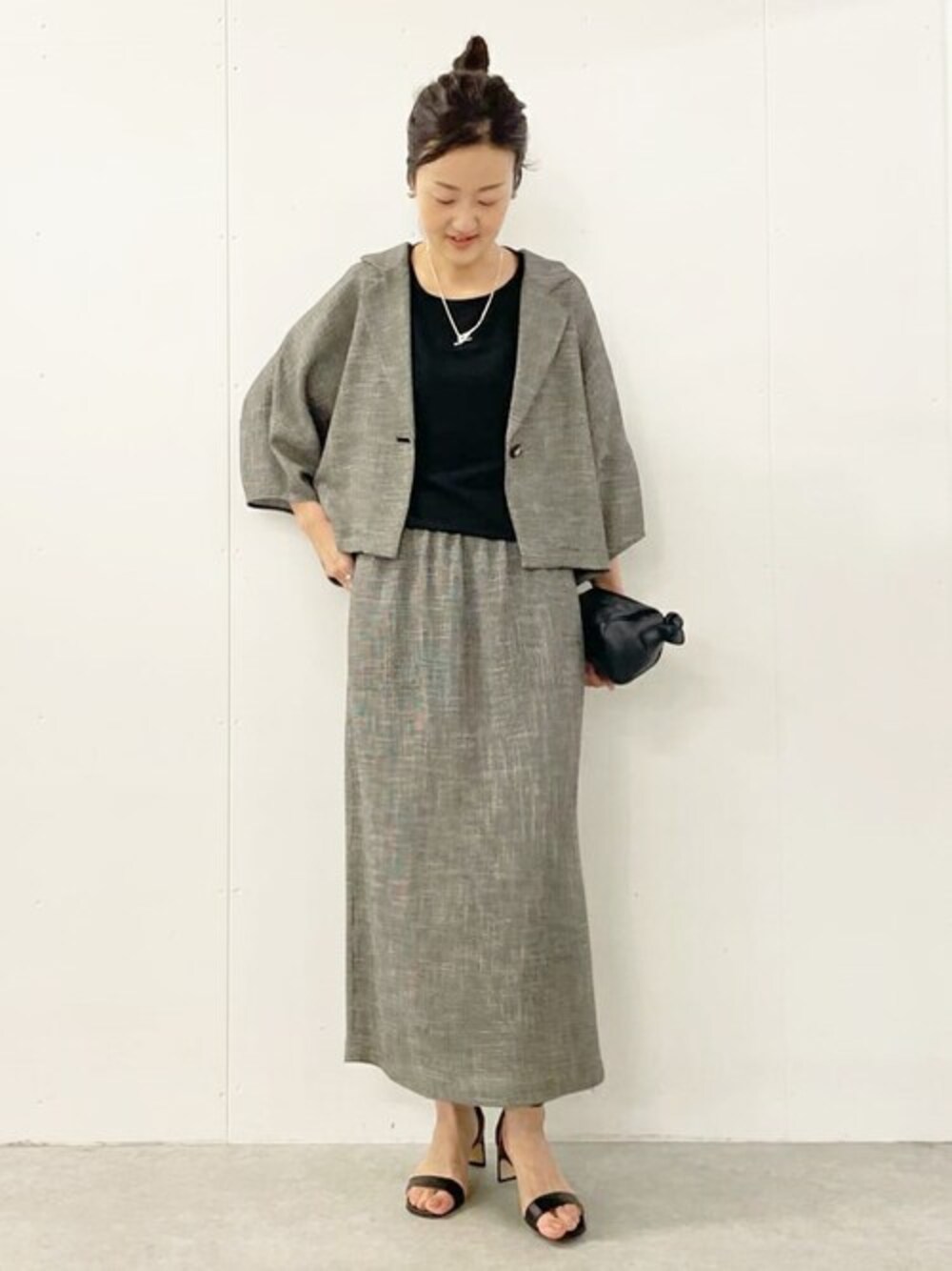 【ジャケット】Fサイズ 細かいチェックのツイード織りジャケット。 ツイードですが生地に固さやハリ感などなく、レーヨンが入るのでくたっと柔らかかく落ち感があるのでカーディガン感覚で着ていただけます。 裏地なしでほんのりシアー感あり、夏でも涼しい。 お袖はほんのりパフスリーブで七分袖。 腰位置のすっきりした着丈なので、スカートとのセットアップやワンピーススタイルにもバランスが取りやすいです。 手洗い可 【スカート】Fサイズ ジャケットと同素材のIラインスカート。 ウエストは総ゴムで脱ぎ履き楽ちん。 166cmでくるぶしが見える着丈です。 手洗い可