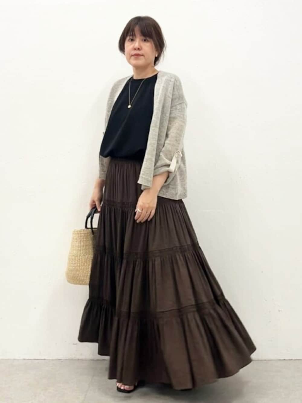 シャーリングティアードスカート ふくらみそうで着ることを躊躇しましたが 長さと生地感 シャーリングの効果もあり すっきり着られます