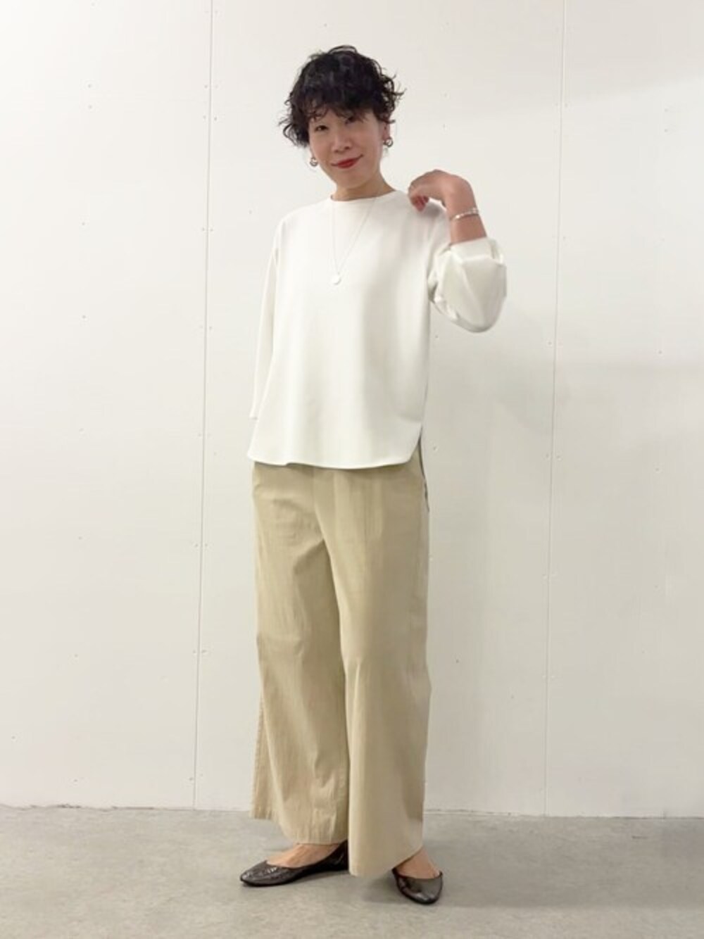 【Tブラウス】 透けずにほんのり光沢感を感じる素材で1枚でも綺麗にみえます。ストレッチ性もあるのでシャツ素材のブラウスよりも気楽に着れるカットソー素材のブラウスです。 シワにもなりにくいので、お洗濯後でも、旅行中でも安心して着れます。 また、重ね着のインナーとしても長さもちょうどいいので、他のニットやカットソーと組み合わせることで、簡単にコーディネートがオシャレになります。 【コットンストレッチウエストリブパンツ】 ウエストリブは締め付けがなく着心地がよく、着脱も楽なのでついつい履いてしまうパンツです。 中でも特にサラッと感じるのが今回の素材です。 コットンといえ凹凸感があるので、体には点で触れるようなイメージでサラッと感じます✨ 3サイズ展開2サイズ着用