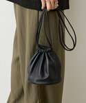 【Tシャツ】Fサイズ 強撚(きょうねん)という細く糸を撚ったカットソー生地なので、かなり薄手で肌あたりがとても心地よいTシャツ。 毎年色違いで揃える方も多いシリーズです。 今年はゆるっと二の腕隠れる袖丈で、着丈はワイドボトムとも合わせやすいすっきり丈にリニューアル。 手洗い可 【ジャケット】Fサイズ ノーカラーですっきり着られるリネンジャケット。 生地にも伸縮性があり肩周りやなども楽ちん。 裏地なしなので着心地もとても軽いです。 腰回りカバーできる着丈ですが、すっきりした身頃なのでモダンな雰囲気できていただけます。 手洗い可 【パンツ】Fサイズ ラップデザインのワイドパンツ。 ほんのり光沢感があるのと、深みのあるカーキのカラーでラフすぎない。 生地に落ち感もあるのでワイドですが広がらずシルエットが綺麗です。 ウエストは後ろのみゴム、前はボタンが2つ付くので留める位置でウエストサイズの調節ができます。 後ろにもポケットが付くので、インしてもお尻周りが気になりにくいです。 【バッグ】 MODERN WEAVING 巾着バッグ:こちらも柔らかなラムレザーを使用したバッグ。 コロンとしたシルエットが可愛らしい。 巾着デザインですが、底はしっかりしているので型崩れしにくいです。