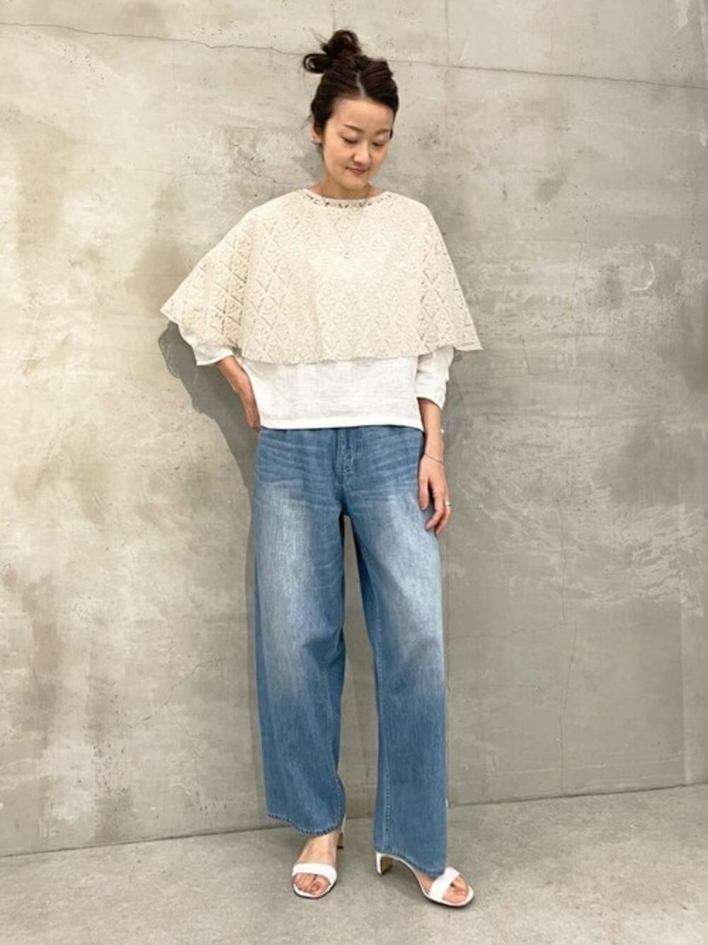 【レースポンチョ】Fサイズ シンプルなTシャツやブラウス、ワンピースなどに重ねると素敵なレースポンチョ。 リネンのハリ感があるのでレースがくたっとせず上品な印象です。 背中のボタンで、後ろはスリットになっているので抜け感が出ます。 同レースをたっぷり使ったスカートもあります。 【ブラウス】Fサイズ 《15 quinze》 上質な100%ピュアリネンを使用したブラウス。 しっとりとした肌あたりの優しいリネン生地で、とても着心地が良いです。 ゆったりしたシルエットでラフさもありつつ、ほんのりシアー感があるので女性らしさがあります。 ヒップにかかるくらいの着丈で、ボトムのシルエット問わずに合わせやすいです。 【デニム】Fサイズ 伸縮性はないですが、柔らかなデニム生地でこれからの時期にもストレスなく穿けそうです。 ウエストには細いベルト付きで、縫われているので取り外しはできませんが、後ろにさりげないリボン付きでポイントになります。 手洗い可