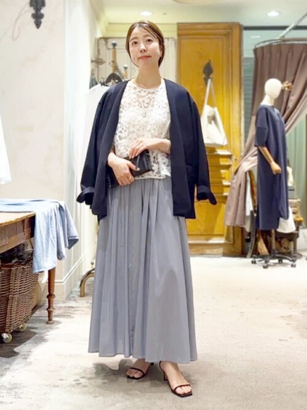 【jacket】Fサイズ ネイビー着用 昨年も人気だったノーカラージャケットが今年も登場。 顔周りがスッキリ見えるノーカラーデザイン。 肩、腕周りはゆとりがあるので、 インナーを選ばず、ドルマンスリーブのブラウス等も重ねやすいです。 シーズン長く着られ、自宅洗い可能。 また、ノーアイロンでOKなのも嬉しい◎ 私もリアルバイして愛用してます! 【blouse】Fサイズ 繊細で複雑な模様が特徴的なリバーレースのブラウス。 柔らかいレースを使用しているので、 堅苦しくなく、肌触りも優しく着心地が良いのも嬉しいです。 【skirt】Fサイズ 爽やかなブルーカラーが目を引くロングスカート。 ニュアンスたっぷりに施されたギャザーで ふんわりとした軽やかなシルエットに。 オンオフ選ばずコーデに取り入れやすいアイテムです。