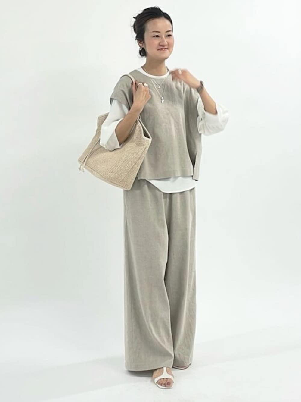 【ベスト】Fサイズ 3/1から予約スタートするリネンシリーズのショートベスト。 ショート丈なのでワンピースに重ねたり、ブラウスとレイヤードしたりと着回しの幅も広いです。 パンツと同素材なので合わせて持っておくと便利です。 【ブラウス】Fサイズ 襟元と袖口がリブになっているニットコンビブラウス。 身頃はシワになりにくいので普段もお仕事用にも気兼ねなく着ていただけます。 【パンツ】2サイズ ウエストリブシリーズからリネンタイプが登場。 ウエストがラクなのはもちろん、 ポリエステル混紡の生地なのでリネンですが伸縮性もあります。 166cmで2サイズをウエスト一折りして穿いています。