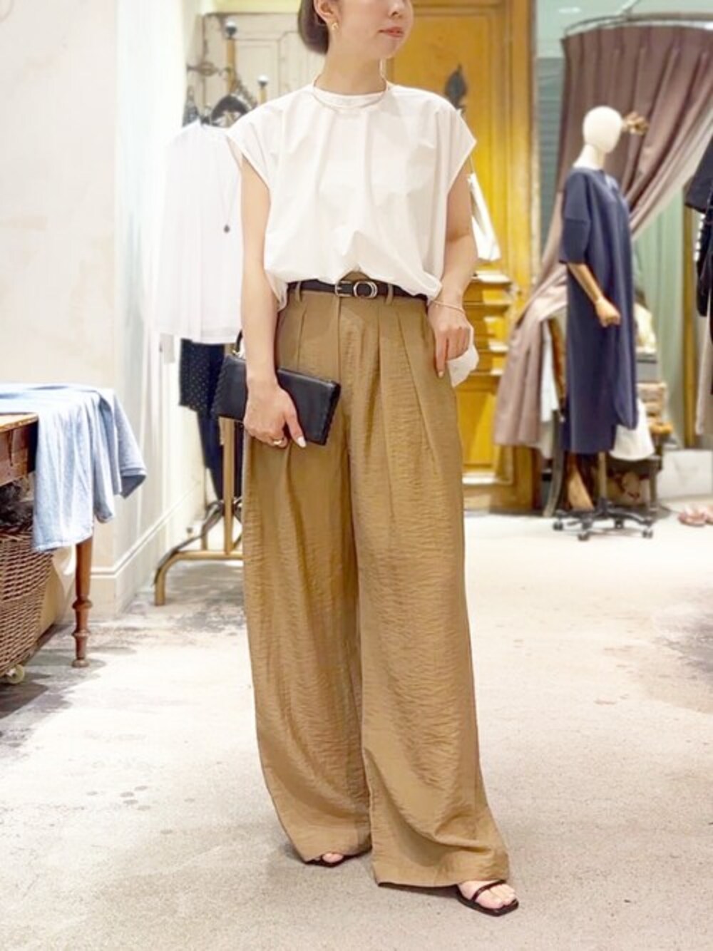 【blouse】Fサイズ 華やかなバルーンシルエットが着映えるブラウス。 柔らかなフォルムが女性らしさを引き立ててくれます。 後ろボタンがコーディネートのポイントに。 【pants】Fサイズ 見た目以上に軽やかなワイドパンツ。 サラッと薄手なのでこれからの季節にも。 さりげなく施されたダブルタックが、腰回りをすっきりと見せてくれるデザインです。 ウエストから裾にかけて自然な落ち感があり、脚長効果も◎ お仕事服にもおすすめです。 【jacket】Fサイズ ネイビー着用 昨年も人気だったノーカラージャケットが今年も登場。 顔周りがスッキリ見えるノーカラーデザイン。 肩、腕周りはゆとりがあるので、 インナーを選ばず、ドルマンスリーブのブラウス等も重ねやすいです。