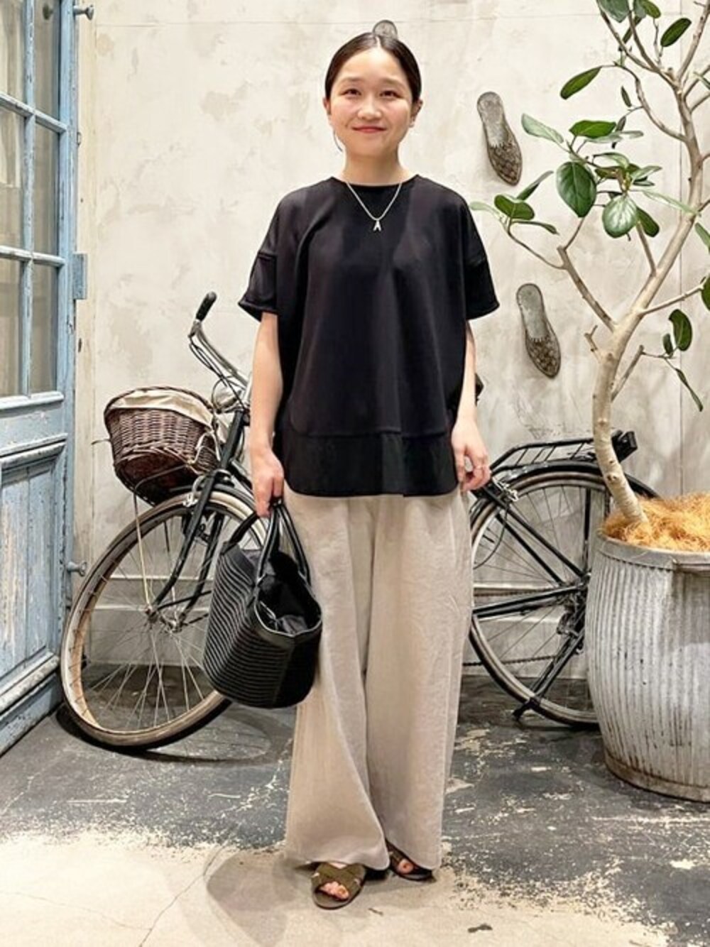 【トップス】着用サイズ:F 大人気のTブラウスと同じく、ストレッチ抜群で透けにくい素材を使用した半袖トップス。 背中にはタック入り、裾には異素材を組み合わせて単調にならないデザインと、低身長でもバランスがとりやすいサイズ感です。 コットンのTシャツよりきちんと感を演出してくれ、洗濯の型崩れも起きにくいのも魅力です。 【パンツ】着用サイズ:0 定番ウエストリブパンツのリネン素材。 リネンですがストレッチが効いていて、やわらかいので着心地も肌触りも良いです。 Tシャツ合わせなどシンプルコーデも涼しくかつオシャレ見えするので、リネンボトムは一本抑えておきたいアイテムです! 【バッグ】dragon