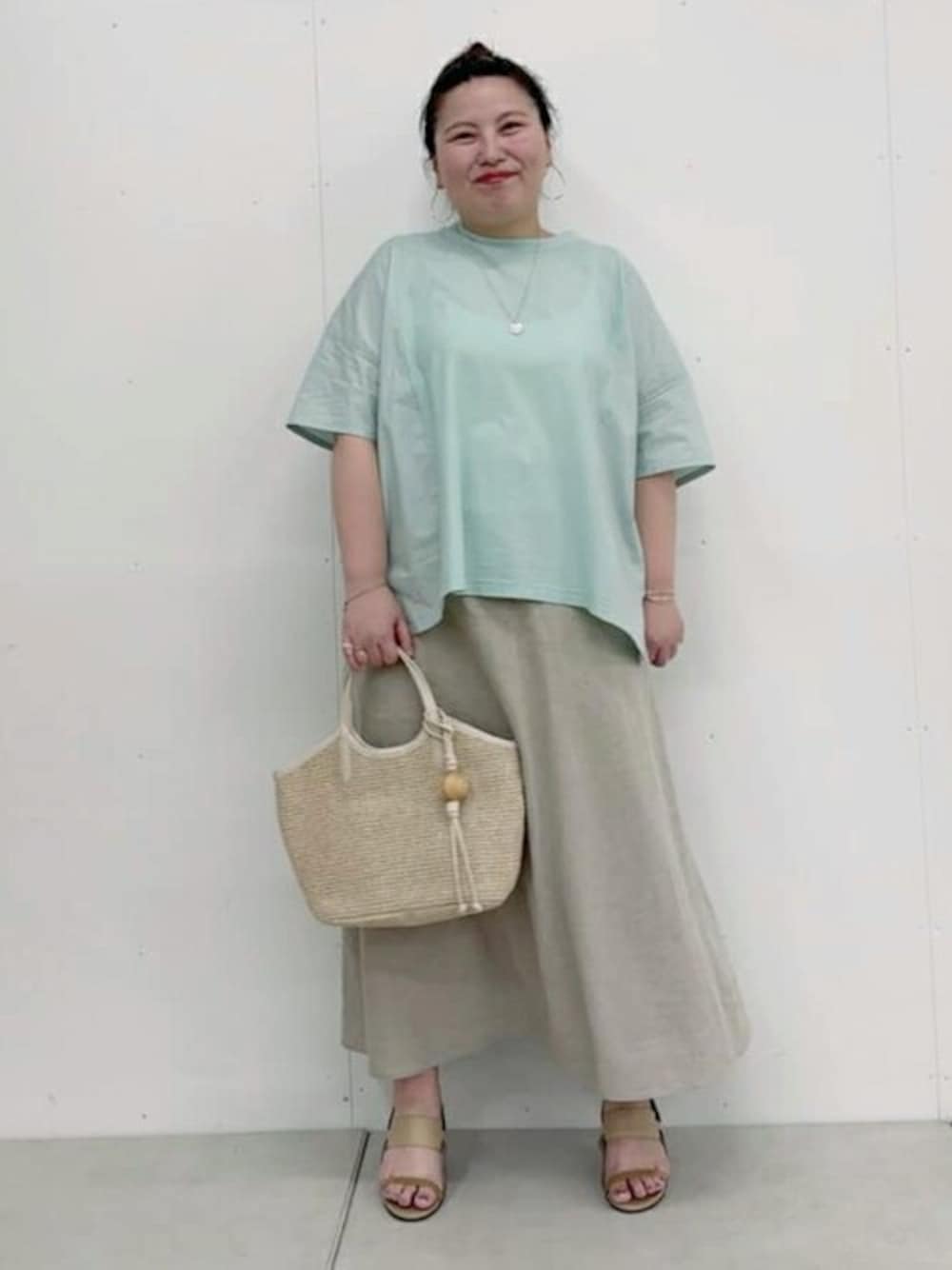 【トップス】 ゆったりしているカットソー。 腰まわりもしっかりカバーしてくれます。 とっても綺麗なカラーで涼しげ。 真ん中はカットソー素材です。 お袖は二の腕隠れて肘も隠れます。 バランスで折り返しで着てもかわいいですよ! 【スカート】 ウエストがリブでゴムのところを折り返すと着丈変えれます! フレアですが、腰まわり気にせず着れるの嬉しいです! 158センチで少し足首見える着丈です。 去年リアルバイをして、ベストとセットアップで良く着てました ストレッチが効くのでとっても着やすいです。 ボリュームあるように見えるのですが、リネンなので馴染んできます