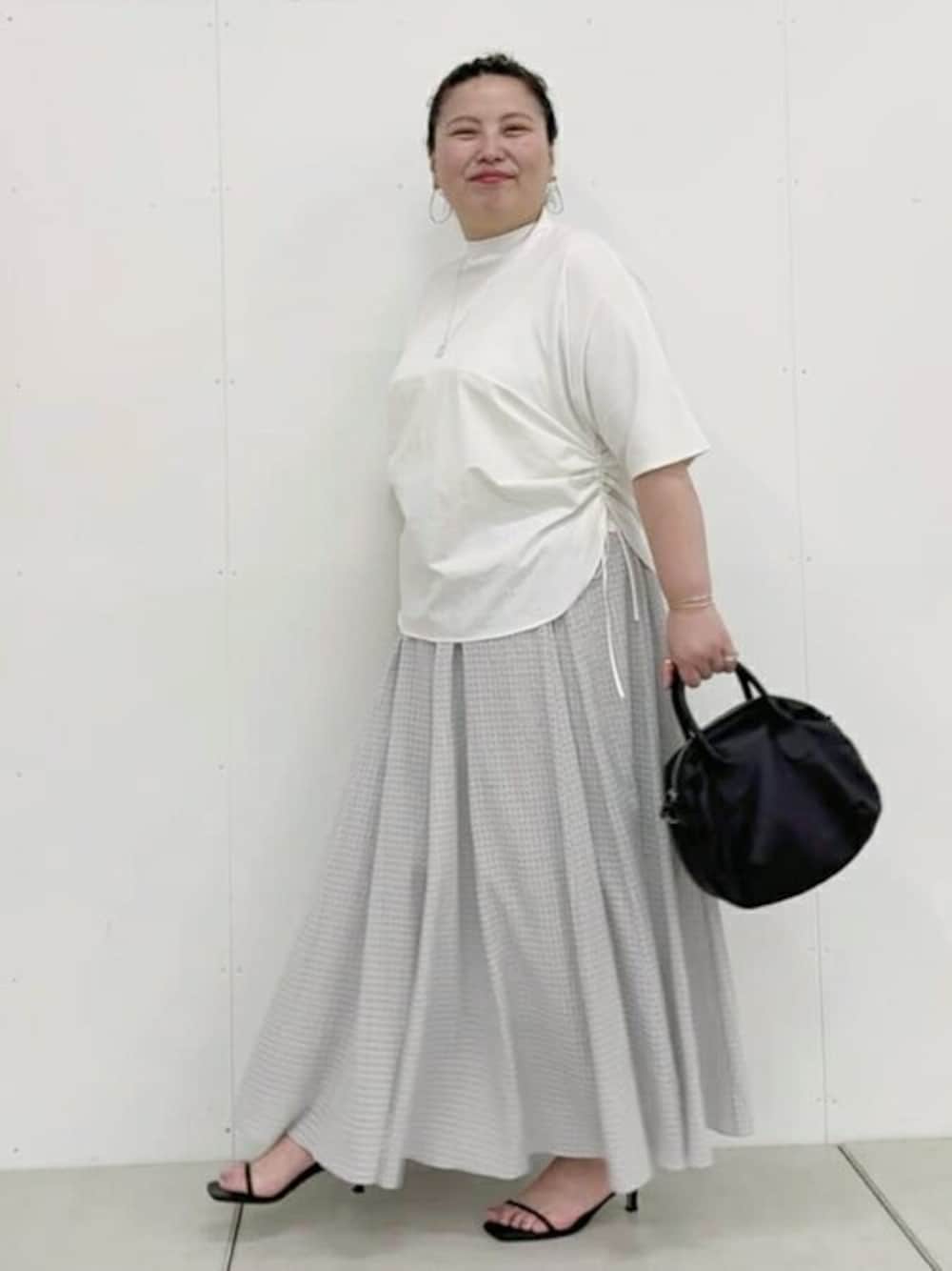 【トップス】 サイドを絞ると着丈が変えられます。 胸の位置で切り替えになっているので、ライン広まずに着れます。 二の腕や肘が隠れるので安心。 腰まわりやお腹まわりカバーしてくれますよ! 【スカート】 ウエストゴムですが、私にはちょっときつめです。 ですが、気になる腰まわりやお腹など、、 スカートが包み込んでくれるます。 フレアスカートですが、生地が軽く風を含んだ時に ゆらゆら動いて素敵です。 158センチの身長で着丈長めです。 よく見るとチェック柄でシア感があります。 透けないようにペチコートがスカートについてました。 セットアップのトップスと合わせると素敵ですよ!
