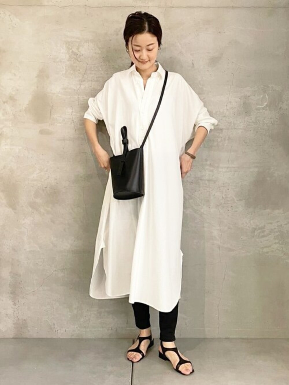 【ワンピース】Fサイズ オックス生地なので程良い厚みがありシャツの嫌なハリ感がないのが特徴。 ドライタッチなコットン生地で肌に張り付く感じがないです。 オーバーサイズなのでばさっとラフに着るのがこなれ感が出ます。 手洗い可 【バッグ】 AHRRE STUDIOのバケツ型バッグ。 しっかりしたセミハードのレザーを使用しているので荷物を入れても型崩れしにくいです。 取り外しできるショルダーベルト付きで、金具はバッグの内側についているので表からは見えません。 使い込むほどに柔らかくなり、美しい古艶が徐々にでてきて育てる楽しみがあります。