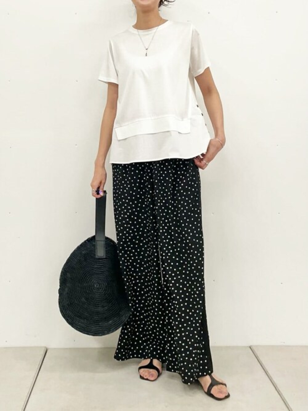 【カットソー】Fサイズ 身頃は柔らかなカットソー生地、背中と前裾は布帛生地がコンビになったカットソー。 レイヤード風デザインで1枚でおしゃれに決まります。フレアシルエットでラインが綺麗。 両サイドにボタンが付いていてアクセントになります。 手洗い可 【パンツ】1サイズ着用 細かなドット柄がコーディネートのアクセントになるストレートパンツ。 サイドにライン入りでよりすっきりした印象になります。 シワにならず、畳むとコンパクトになるので旅行に持って行くのもおすすめ。 ウエストは総ゴムで楽ちんです。 166cmで1サイズ着用、くるぶし隠れるしっかり長さありです。