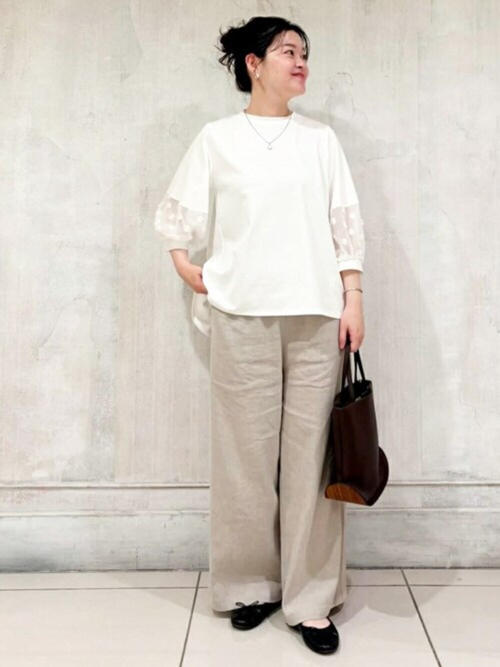 お袖が華やかなビアズリーらしいカットソーのご紹介です。 【カットソー】Fサイズのみ お袖にドットの刺繍がほどこされてあるカットソー。 ちょうど肘が隠れる長すぎない袖丈なので夏まで重宝しそう。 首も開きすぎないので安心! 背中にタックがあるので、身体のラインも拾わず汗でペタペタすることもないのが嬉しいポイント!お尻も隠れます! 【パンツ】1サイズ着用 下半身ポチャさんの味方、ウエストリブシリーズよりリネン素材が入荷しました! サラッとした素材感で真夏にも◎ 麻ならではの生成り感が涼しげです! 白いパンツは抵抗ある…という方でもこの色味なら挑戦しやすいと思います。 157cmで1サイズですが、いつものウエストリブシリーズより少し丈が長めです!