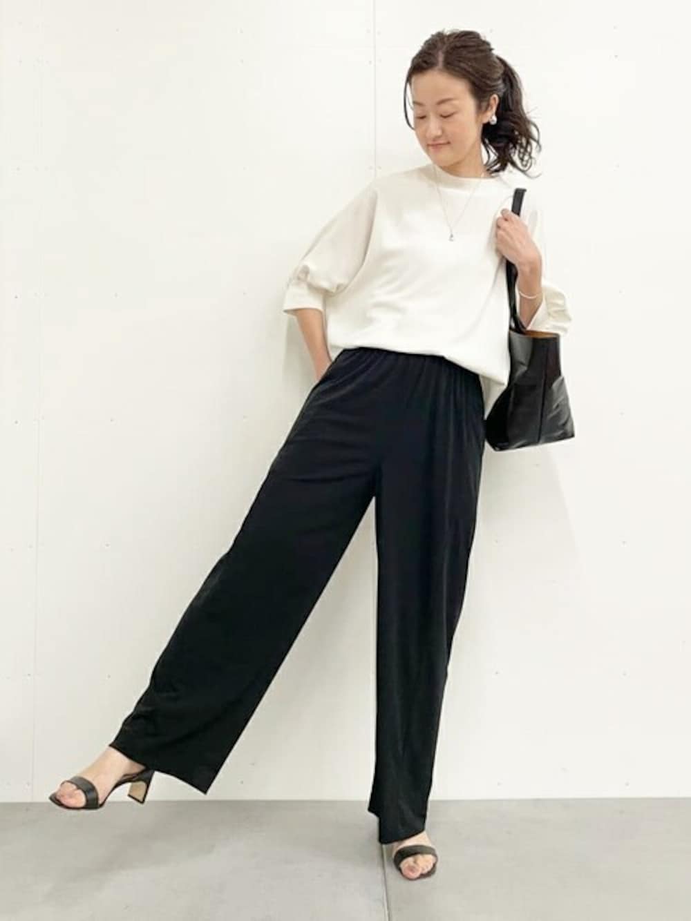 【ブラウス】Fサイズ 襟と袖にリブニット生地がコンビになったブラウス。 身頃の生地はシワになりにくい。 1枚で簡単様になるブラウスです。 手洗い可 【パンツ】1サイズ着用 ウエスト・生地もストレッチ抜群でジャージのように穿きやすいパンツ。 ワイドパンツの中でも太すぎなくて バランスが取りやすいな〜と思いました◎ 私は166cmで1サイズ着用、くるぶしほどの着丈です。 雨で濡れても汚れが気にならなかったり、 洗った後のシワも気にならないので扱いも楽なのが嬉しいです。 手洗い可