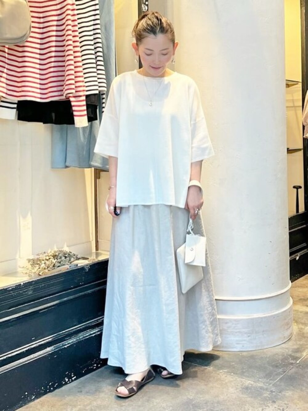 【skirt】着用サイズ 1size フレアシルエットが綺麗なスカート ウエストゴムで楽ちんに脱ぎ着しやすく 裏地があるので、透け感を気にせずに一枚で着ていただけます。 私の身長でくるぶしが隠れるくらいの長さがある着丈となります。 【tops】着用サイズ F size サラッとした肌あたりでチクチクしにくく 涼しく着やすいニット ヒップラインがすっぽりと隠れるのでパンツスタイルでも安心して着やすいシルエット シワになりにくくお家で洗えるのも嬉しいポイント さまざまなコーディネートに合わせやすい一枚です。