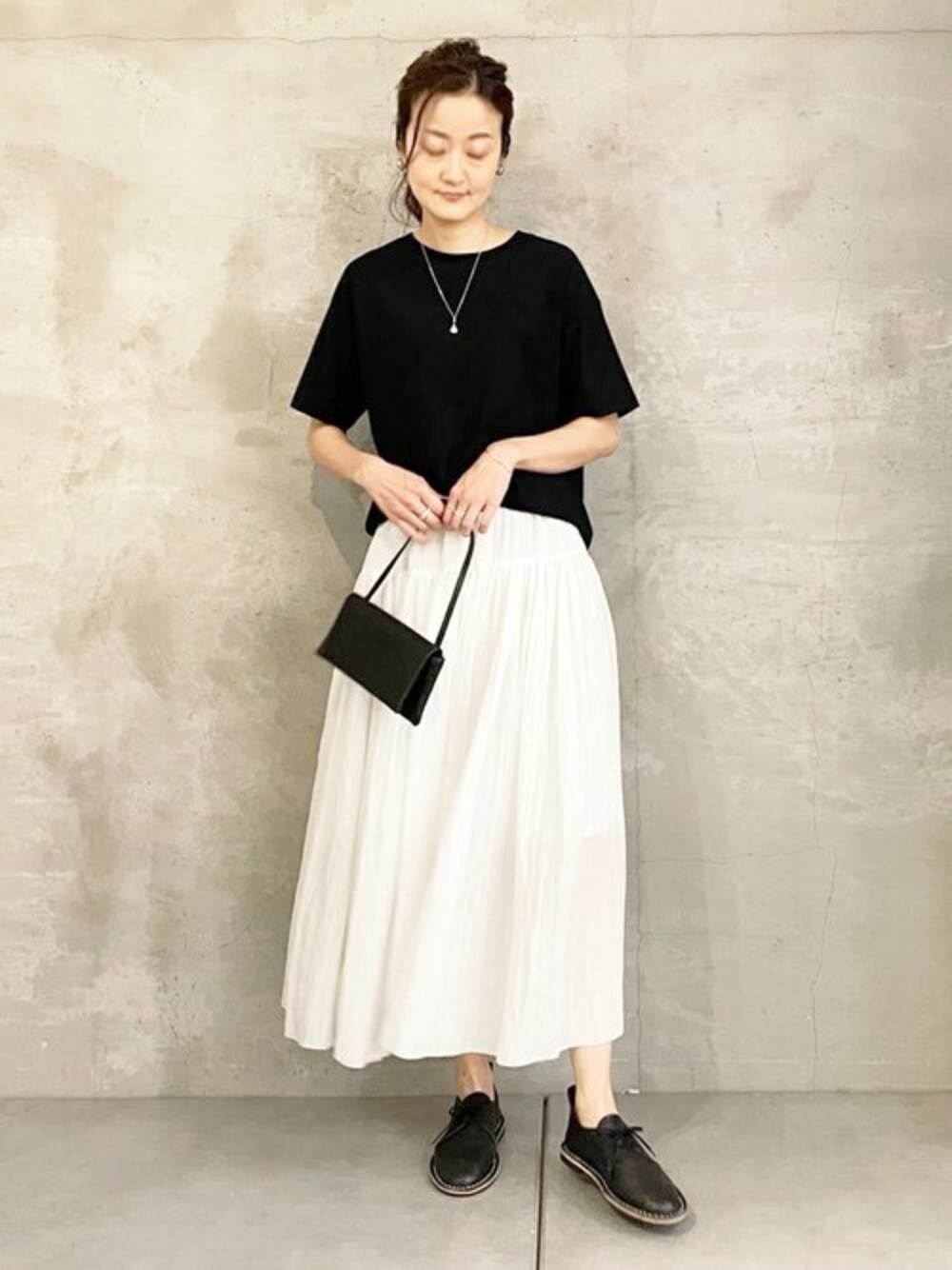 【Tシャツ】Fサイズ シンプルなコットンTシャツですが、気になる二の腕のラインをカバーしてくれる袖丈や、だぼっと見えないシルエットが大人女子も使いやすい。 手洗い可 【スカート】Fサイズ ほんのりシアー感のある細かいストライプ柄の生地で表情がある白スカート。 ウエストは総ゴムでラク。 ウエストからたっぷりギャザーを入れるのではなく、少し下の位置からも生地を足しているので上品なボリューム感になっています。 膝のあたりまで裏地付きです。 手洗い可 【バッグ】 スペインのブランドSTEVE MONO。 流行や年齢を問わず使いやすいベーシックデザイン。 表面に金具がなく、フラップを留める部分にだけスナップボタンがつくのみ。 服装のテイストもシーンも選ばず活躍するクラッチバッグです。 【シューズ】38サイズ着用 柔らかなレザーで足に馴染んでくれるレースアップシューズ。 ステッチがアクセントになります。 足のサイズ24.5cmで、普段38サイズ、物によっては39サイズを履きますが、こちらは38サイズでつま先が当たることもなくちょうどよく履けました。