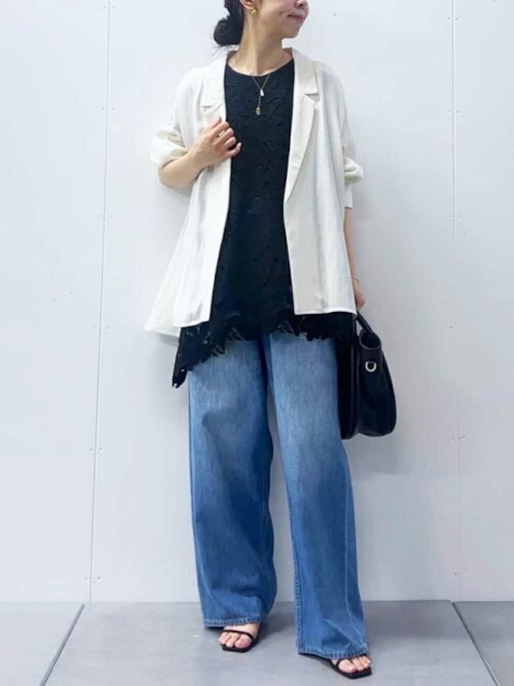 【jacket】Fサイズ 清涼感漂うツイル地のリネン混素材のジャケット 身体のラインを拾いすぎない、 程よくゆとりのあるシルエットは パンツやスカートなど様々なボトムスと好相性。 【blouse】Fサイズ 総レースが華やかなブラウスを デニムでカジュアルダウンしたコーディネート。 両サイドが長めのデザインで 動く度に揺れ感が綺麗なのもポイント。 長さがあるのでさりげなく体型カバーも叶います。 一枚で着ても、ジャケットやカーディガンと重ねても素敵ですね。