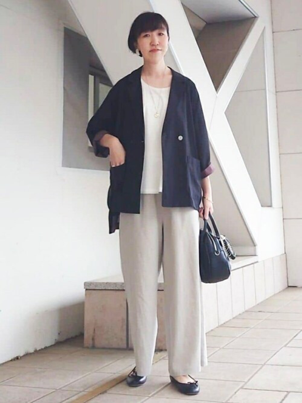 【ジャケット】 シャツ感覚でラフに羽織れるシアージャケット。 薄い素材なので、黒でも重たく見えにくいです。 大人世代はカジュアルアイテムの上にはこんなジャケットがあれば、きれい目にスタイリングが決まります! 身幅もアーム周りもゆったりしているので、風通し良く着られますよ。 【インナー】0サイズ着用 ストレッチのきいたシャツ生地なので着やすく、見た目にもきちんと感あり頼れるアイテムです。 首開きは横に広めでスッキリしています。 意外と困るカーディガンのインナーにおすすめです! ※私は上半身薄い体型なので、Fサイズは首開き大きくて気になります。0サイズの方が安心感あります。 【パンツ】1サイズ着用 麻なので真夏もサラッと快適に穿けます。 ポリエステルを混紡しており、適度にハリがあるのでクタクタになりにくいところも良いです。 ウエストはリブタイプなのでストレスフリーな穿き心地。 身長164㎝で1サイズは足首あたりのスッキリした着丈になります。 フルレングスがお好みでしたら2サイズもおすすめ。