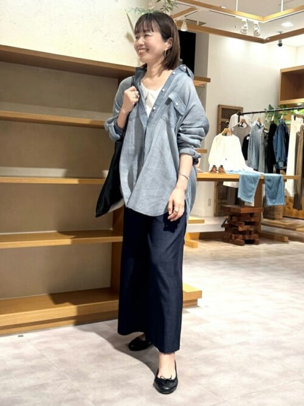 【シャツ】Fサイズ 柔らかい薄手コットンのデニムシャツ。 ゴワゴワしないので肌馴染みが良く、軽い着心地です。 ボタンを開けて、真夏の羽織としても使えます。 【タンクトップ】Fサイズ ソフトな肌触りのコットン100%。ネックが開き過ぎていないので、見せるインナーとしても使いやすいです。身頃ゆったり。 【パンツ】1サイズ着用 サラッとした着心地です。 落ち感が良くて動くとドレープがきれい! ウエストは幅広のリブでゴムなのでお腹周り楽ちんです。 カジュアルでもきれいめでも合わせられます。 【バッグ】 柔らかくて軽いラムレザー。 シンプルで削ぎ落とされたデザインが、どんなコーディネートにも合わせやすいです。