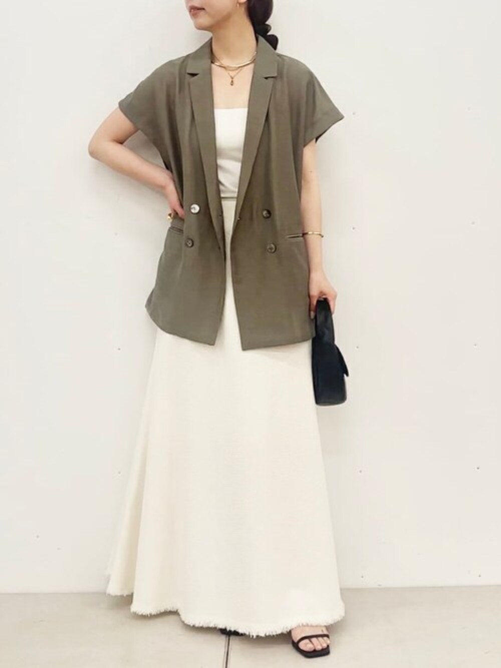 【jacket】Fサイズ 麻風の素材を使用した 涼し気なメッシュジャケット 程よく二の腕が隠れる袖丈なのも嬉しいポイント 1枚羽織るだけで様になって見えるので 夏のマストアイテムになりそう。 ON/OFF問わずに使えるアイテムです。 【skirt】Fサイズ 尾州ツイードを贅沢に使用したマーメイドスカート。 動く度揺れる裾が美しく、履くだけで様になります。 ポケットや裾に施されたディテールもポイント。
