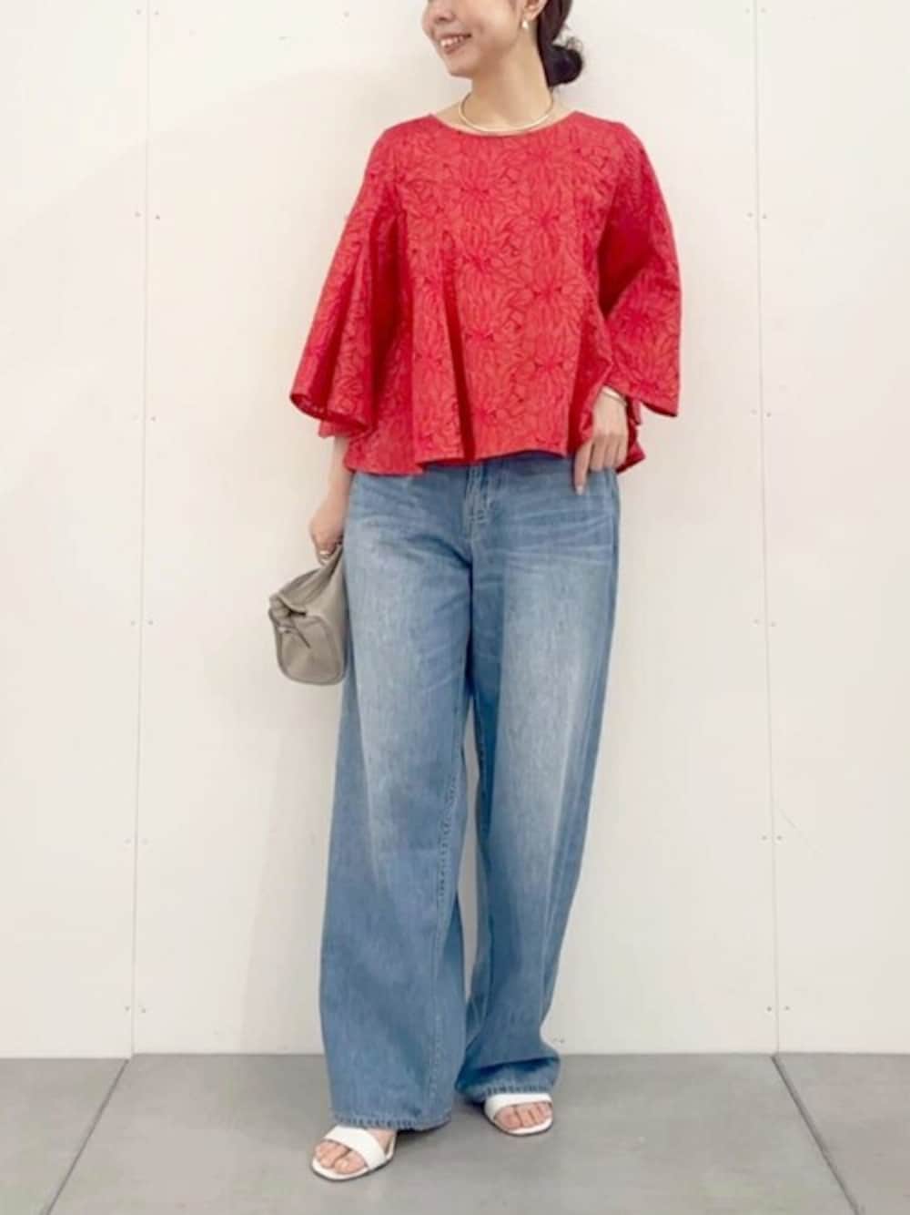 【blouse】Fサイズ 着るだけで華やかな刺繍ブラウス。 栃木県の刺繍職人の手によるオリジナル刺繍を使用。 ゆったりと広がる袖のフレアデザインは 動くたびにやさしく揺れ感が綺麗です。 一見華やかなブラウスですが デニムと合わせることでカジュアルな雰囲気にも。