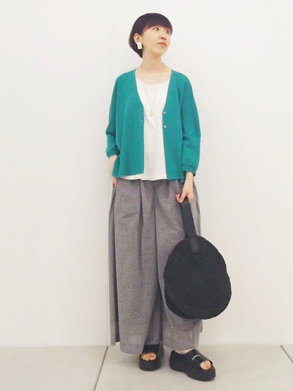 いつもはベーシックな色を選びがちなカーディガンも、たまには差し色を選ぶとコーディネートが新鮮になるのでおすすめです! 【カーディガン】 前後差のある絶妙なバランスで、どんなアイテムにも好バランスで着られるデザインです。 シャリ感のある糸で、その名のとおりサラッと快適な着心地です。 夏の冷房対策にも便利で毎年色違いで揃える方が多い人気シリーズです。 【インナー】0サイズ着用 ストレッチのきいたシャツ生地なので着やすく、見た目にもきちんと感あり頼れるアイテムです。 首開きは横に広めでスッキリしています。 意外と困るカーディガンのインナーにおすすめです! ※私は上半身薄い体型なので、Fサイズは首開き大きくて気になります。0サイズの方が安心感あります。 【パンツ】1サイズ着用 ロングスカート感覚で穿けるボトムスです。 1枚で存在感あり、オシャレ見えするのでトップスはシンプルなTシャツも好相性。 高身長な方も安心の着丈です。 細かめなチェックなのでカジュアル見えしすぎずに大人も使いやすい! 【サンダル】24.0cm着用 いつも24cmの靴を履いているのですが、やや大きめで、23.5㎝でも大丈夫でした。 幅広い足の方でも楽に履けると思います。 レザーとのコンビなので、楽な履き心地なのにきちんと見えるところが良いなと思いました。