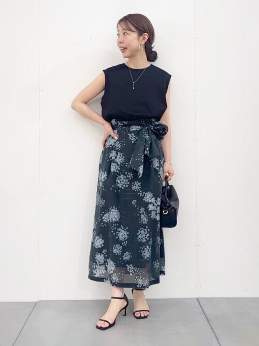 【skirt】Fサイズ 上品な光沢感のあるオーガンジー素材がエレガントなスカート。 夜道の白い紫陽花をモチーフに描いたオリジナル柄が目をひく一枚。 Tシャツやカットソー素材のアイテムと合わせれば カジュアルな雰囲気でも着られます。