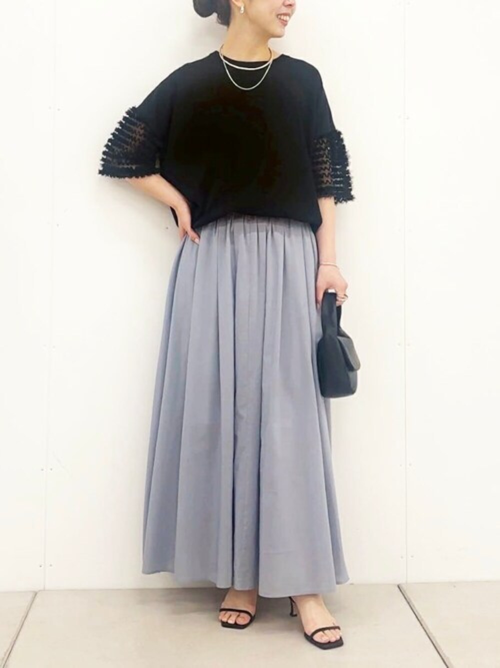 【トップス】Fサイズ 袖はチュール素材に同色のリボンテープをあしらったこだわりの一枚。 見頃は薄手のニット素材で着やすいのも嬉しいです。 着るだけでさり気なく華やかな雰囲気に。 【スカート】Fサイズ 爽やかなブルーカラーが目を引くロングスカート。 ニュアンスたっぷりに施されたギャザーで ふんわりとした軽やかなシルエットに。 オンオフ選ばずコーデに取り入れやすいアイテムです。