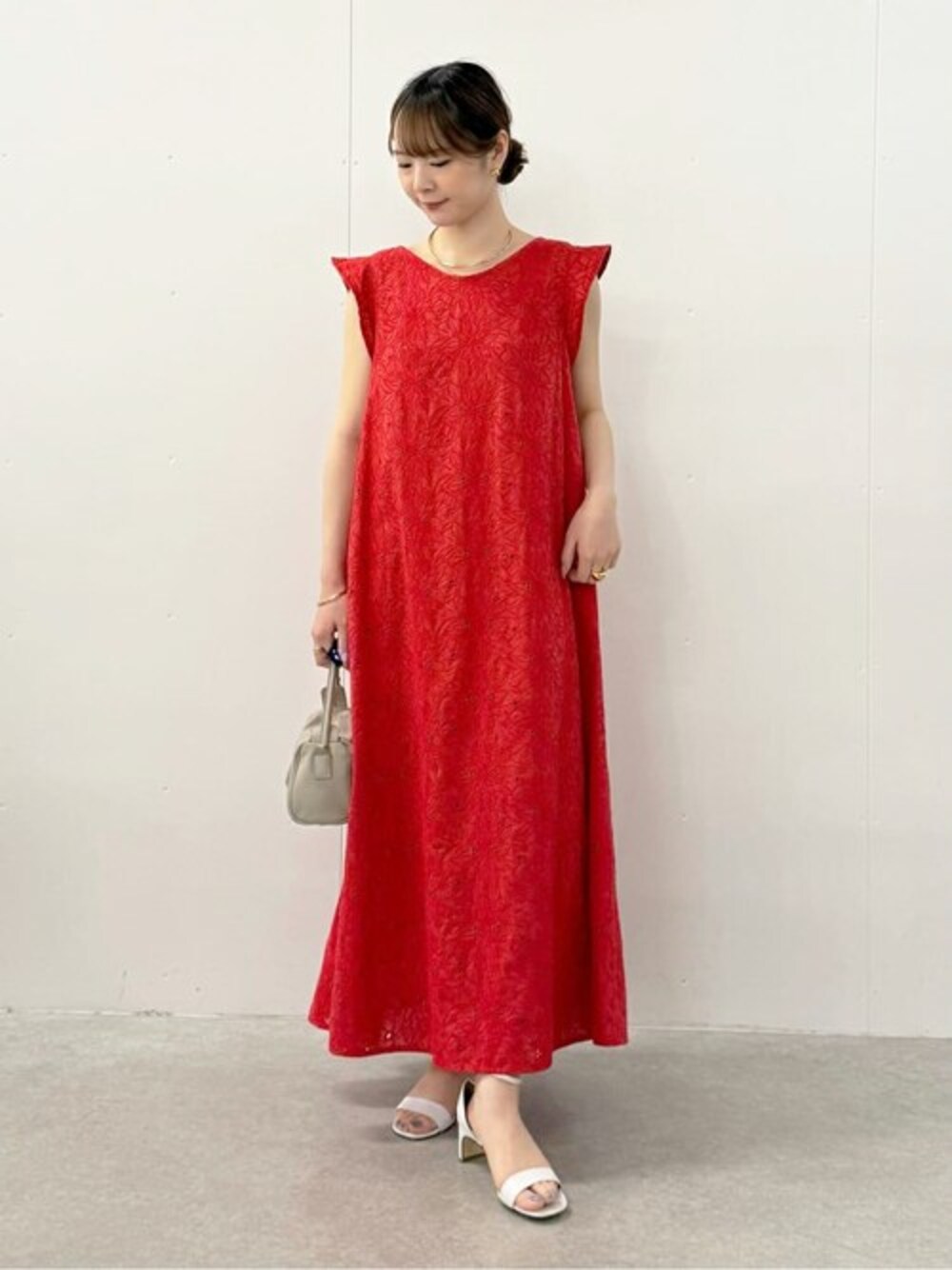 【one-piece】着用サイズ:F 凛とした華やかさをまとう、上品な夏の一着。 刺繍が美しく映えるAラインのシルエットは、体のラインを拾いすぎず軽やかに広がるデザイン。 背面にはさりげない切り替えを施すことで立体感が生まれ、後ろ姿まで抜かりない仕上がりに。 動くたびにふんわりと揺れ、涼しげでエレガントな印象を演出します。 シャープなカットの袖が甘さを程よく引き締め、大人の洗練を感じさせる仕上がりに。 また、透け感を気にせず着られる安心のペチコート付きで、1枚でさらりと着られるのも嬉しいポイント。 日常のお出かけから、リゾート、ちょっとしたお呼ばれまで、夏の様々なシーンで活躍する一着です。