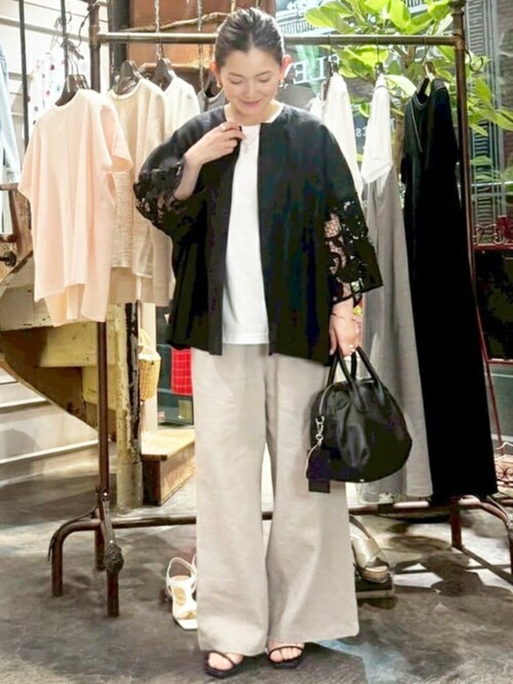 【jacket】着用サイズ F size お袖のレースがポイント ゆったりシルエットのジャケット リネン素材なので、風通しよく 涼しく夏場にも羽織りやすいジャケット ワンピースやスカートの羽織りとしてもおすすめです。 【pants】着用サイズ 1size リネン素材の軽やかなパンツ ストンと落ち感がありワイドなのにスッキリ穿きやすいパンツ リネンなので風通しよく サラサラとしているので、真夏にもおすすめです。