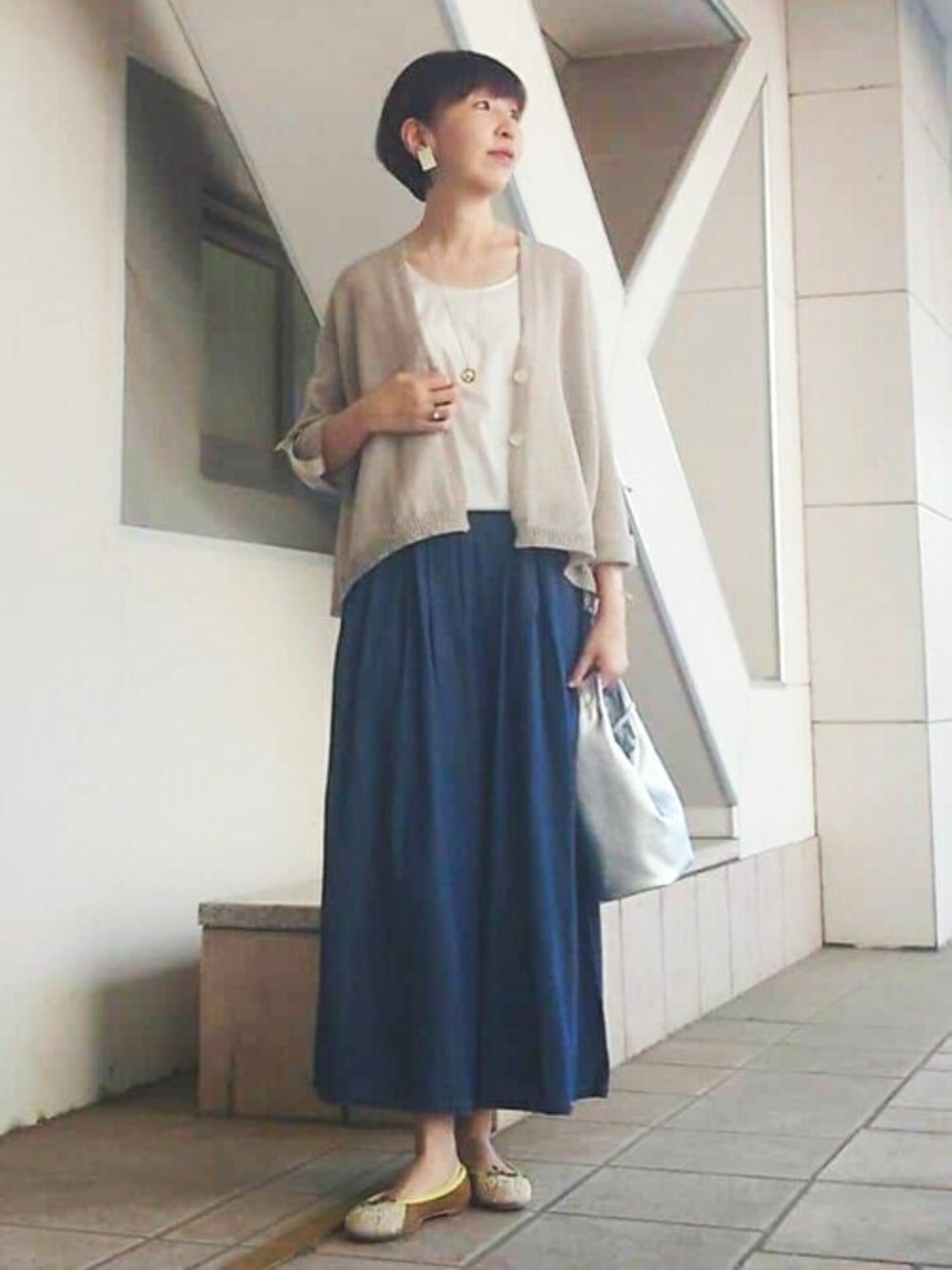 アラフィフ世代のお出かけコーデにぴったり! ロングスカート感覚で穿けるパンツは、生地感柔らかくストレスフリーな着心地です。 【ニット】 ザクッと目の粗めな清涼感あるカーディガン。 スカート、ワイドパンツ、ワンピースの上にバランス良く合うデザインなので初夏〜初秋まで大活躍です! お袖ロールアップできるところも使いやすいです。 麻ですが、糸が柔らかめでチクチクしにくいと思います。(個人差あるので私の見解です) 【インナー】0サイズ着用 ストレッチのきいたシャツ生地なので着やすく、見た目にもきちんと感あり頼れるアイテムです。 首開きは横に広めでスッキリしています。 意外と困るカーディガンのインナーにおすすめです! ※私は上半身薄い体型なので、Fサイズは首開き大きくて気になります。0サイズの方が安心感あります。 【パンツ】 後ろゴム仕様、かなりウエスト周りは広がりますので楽な穿き心地です。 生地感は柔らかく、夏でも風通し良く涼し気です。 パンツが苦手な方でもこちらならスカートっぽくて抵抗なく穿けそうです。