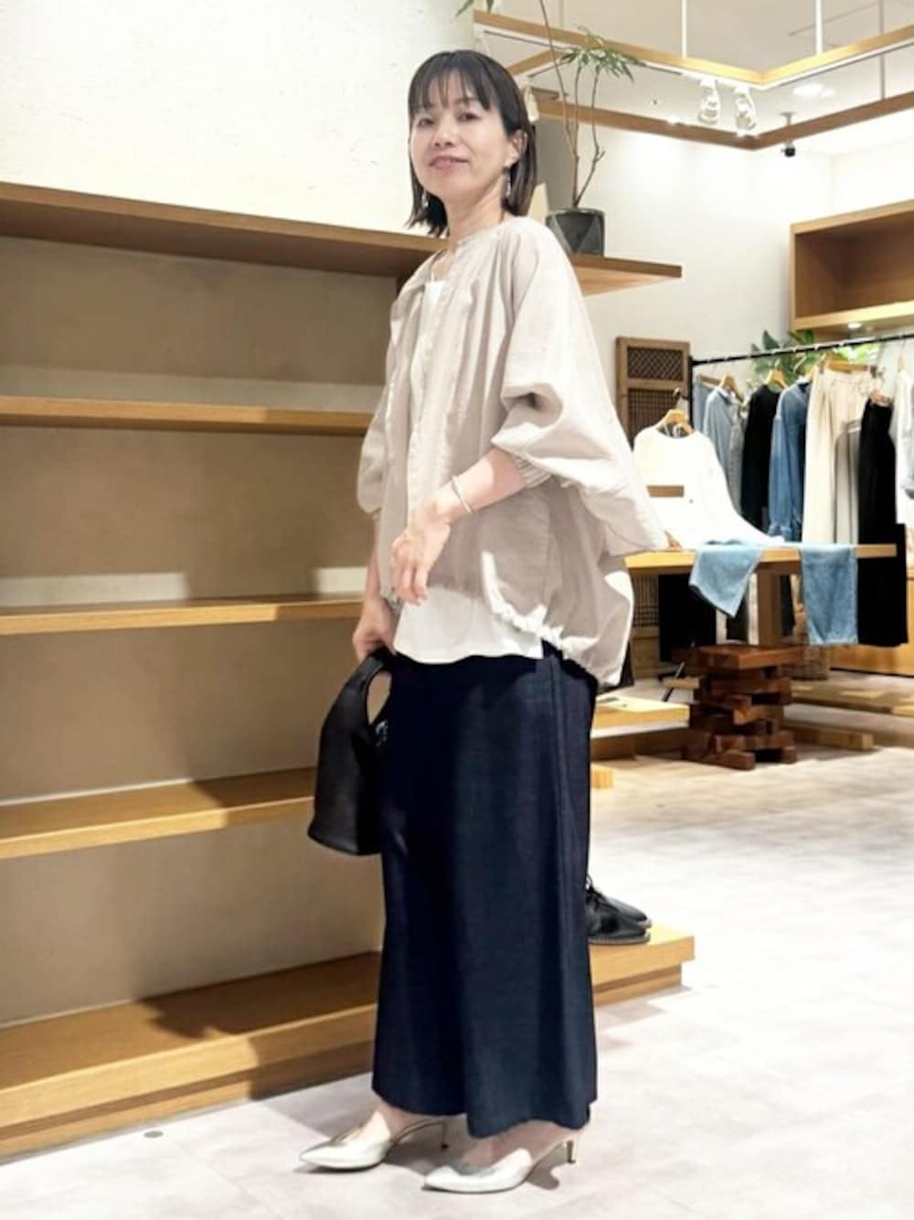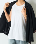 【ハオリ】Fサイズ ソフトでシャカっとした生地です。 背中のフリルがお袖と繋がっていて、さりげなくて甘過ぎないデザイン。 フロントはフックが2つ。裾はサイドで絞れます。 袖口のゴムもシルエットのポイントに。 身頃ゆったりで、インナーにドルマンスリーブも着込めます。 【タンクトップ】Fサイズ ソフトなコットン素材で肌触り抜群に良いです。 ネックが程よい開きで、見せるインナーにおすすめ! 【パンツ】1サイズ着用 サラッとした着心地です。 落ち感が良くて動くとドレープがきれい! ウエストは幅広のリブでゴムなのでお腹周り楽ちんです。 カジュアルでもきれいめでも合わせられます。 【バッグ】 ハンドルと本体が一体となってコロンとした形がかわいい。レザーですが軽いです。 【ネックレス/ピアス】 雫型のモチーフが縦ラインを強調してくれてすっきり見えます。 【リング】 シルバー。繊細且つ、ちょっと凝ったデザインが、シンプルなものと重ね付けしてもかわいいです。