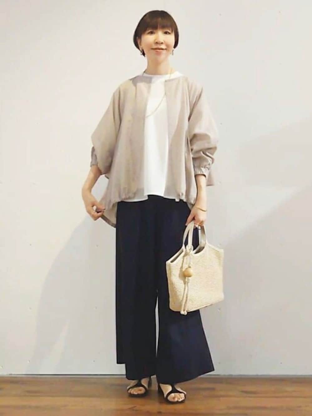 少しハリ感のある素材のブルゾンなので、ボトムスには柔らかく落ち感のある生地が好相性です! キレイめコーディネートに便利なアイテムです。 【ブルゾン】 軽やかで暖かめな日の軽い羽織りにピッタリです。 ドルマンスリーブなので中に着るものを選ばず、シワもあまり気にせず着られる素材感です。 甘すぎず、大人にも着やすいデザインですよ! 【パンツ】1サイズ着用 微光沢の生地感なので、キレイめなスタイリングにもピッタリです! ストンと落ち感があり、ウエストリブパンツの中でもすっきり見えるシリーズ。 ウエストは柔らかいゴムになっており、ストレスフリーな履き心地。 164cmでくるぶしくらいのすっきりした着丈になります。 【スカート】1サイズ着用 生地が柔らかくスルンと落ち感があり、とにかく華奢見えするデザインです。 シーズンレスで活用できるスカートですよ。 お腹周り〜ヒップのラインも拾いにくいです。 歩いたときの裾の動きがエレガントな雰囲気。 アイボリーは裏地付きなので透ける心配ないですよ。 【バッグ】 夏に必要な持ち物がしっかり入りました! ペットボトル、日傘、貴重品、カーディガンetc… 実用性に加え軽いのも魅力です。 コーディネートに抜け感が出せて、カゴよりナチュラルになりすぎないところもアラフィフ世代におすすめポイント。に抜け感が出せて黒も重く見えないです。