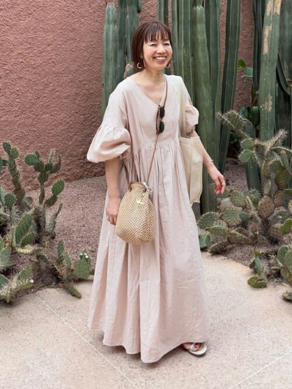 【ワンピース】Fサイズ コットンとリネンの混合生地。 肌に馴染む黄色味のあるピンクです。襟ぐりのVネックがネック周りをスッキリ見せてくれるので、甘くなりすぎずアラフィフの方もも着やすいです。 袖口のシャーリングで、するっとお袖をあげやすく、パフ袖になってドラマチック。 ざっくりとした風合いなので、おシワが気になりにくく、旅行にもおすすめです! 【バッグ】 イタリアのミラノ発のブランド。つるんとした表面なので肌あたり良く、暑い日もベタつかずに持ちやすいです。 ストラップの肩側を伸ばしてして斜めがけにしていますが、両方の長さを揃えて手で提げるのもかわいい! 意外とマチがあるので、折り財布、ポーチ、ハンカチ、メガネケース、250mlペットボトルなど入ります。 【ネックレス】 アンカーモチーフがシーズンムードを高めるデザイン。さりげなく、短めの長さで着けたい時におすすめ!