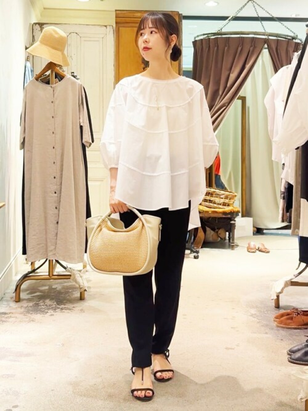 tops :Fサイズ エスカルゴのようならせん模様が特徴的なブラウス。 1枚で着映えできて夏でもサラッと着ていただけます。 pants:1サイズ テロっとした素材感で履き心地がよく、綺麗さもある万能アイテム。 オンオフどちらでも着回し抜群!